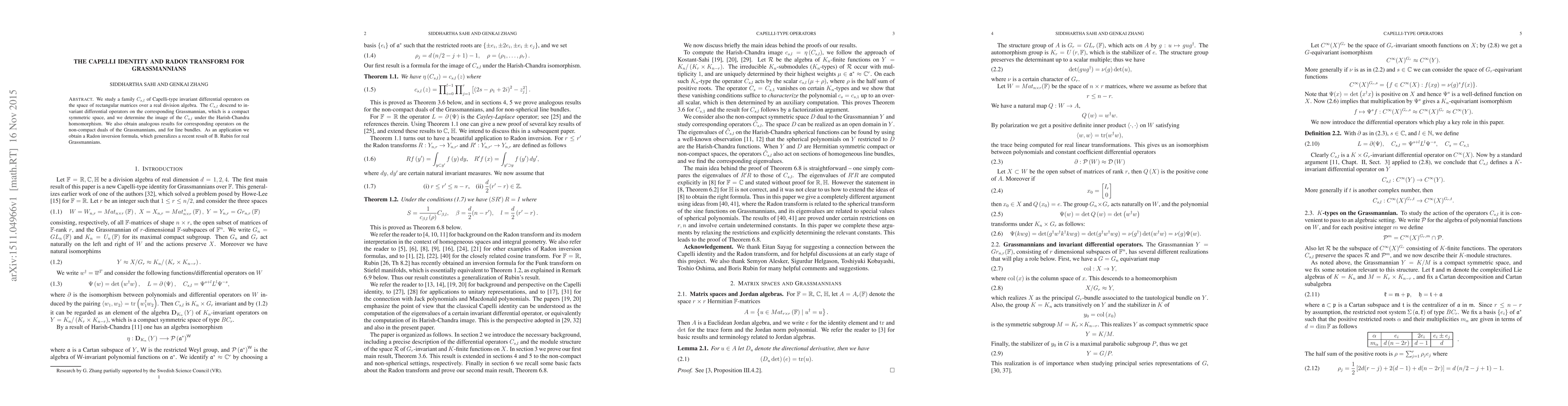 This paper investigates Capelli-type invariant differential operators on rectangular matrices, showing their descent to Grassmannians and determining their images under the Harish-Chandra homomorphism. It also extends these results to non-compact duals of Grassmannians and line bundles, culminating in a generalized Radon inversion formula for real Grassmannians.