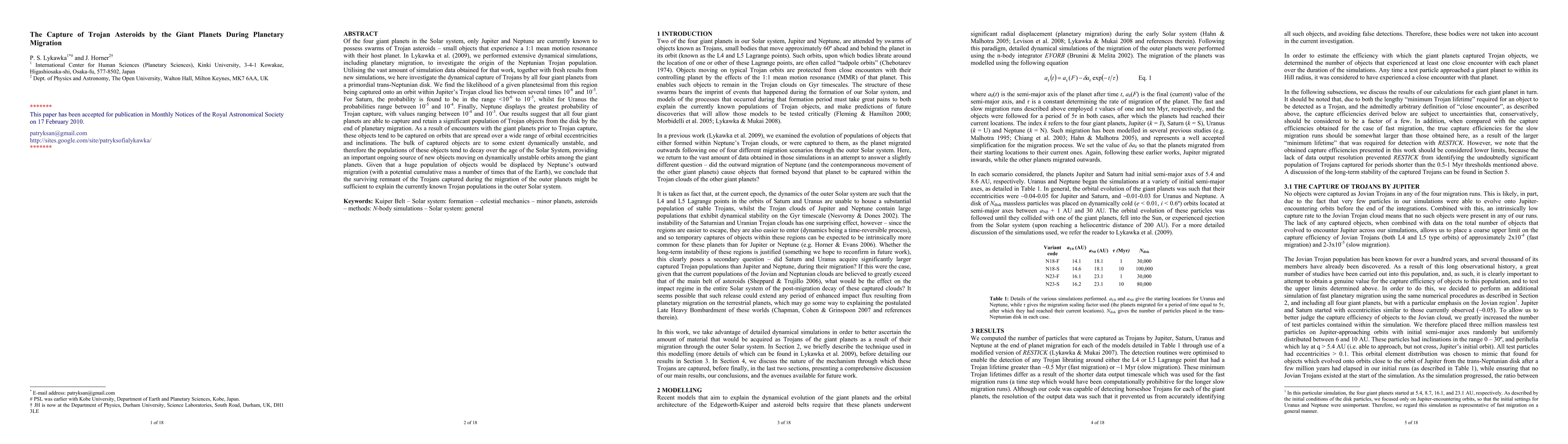 This paper investigates the dynamical capture of Trojan asteroids by the giant planets during planetary migration, finding that Jupiter, Neptune, Saturn, and Uranus all have varying probabilities of capturing Trojans from a primordial disk. The study suggests that the surviving remnants of these captured objects could explain the current populations of Trojan asteroids in the outer Solar System.
