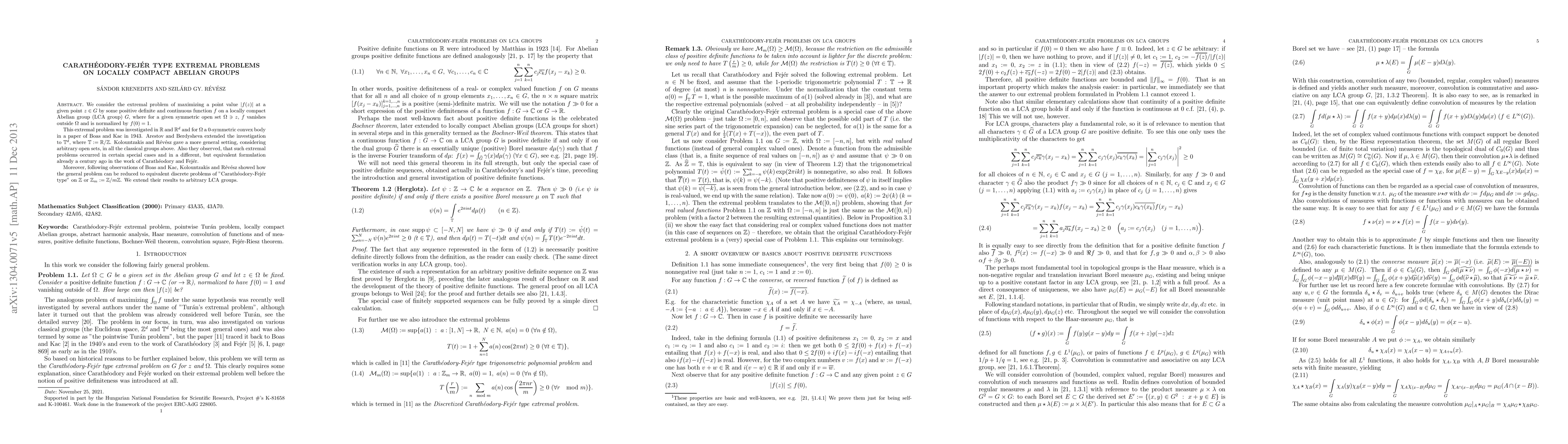 We consider the extremal problem of maximizing a point value jf(z)j at a given point z 2 G by some positive definite and continuous function f on an Abelian group G, where for a given symmetric open set 3 z, f vanishes outside and is normalized by f(0) = 1. Denote the extremal value as CG(; z). This extremal problem was investigated in R and Rd and for a 0-symmetric convex body in a paper of Boas and Kac in 1943. Arestov and Berdysheva extended the investigation to Td, where T := R=Z. Kolountzakis and R?ev?esz gave a more general setting, considering arbitrary open sets, in all the classical groups above. Also they observed, that such extremal problems occurred in certain special cases and in a different, but equivalent formulation already a century ago in the work of Carath?eodory and Fej?er. Moreover, following observations of Boas and Kac, Kolountzakis and R?ev?esz showed how the general problem can be reduced to equivalent discrete problems of "Carath?eodory-Fej?er type" on Z or Zm := Z=mZ. We extend the results of Kolountzakis and R?ev?esz to locally compact Abelian groups.