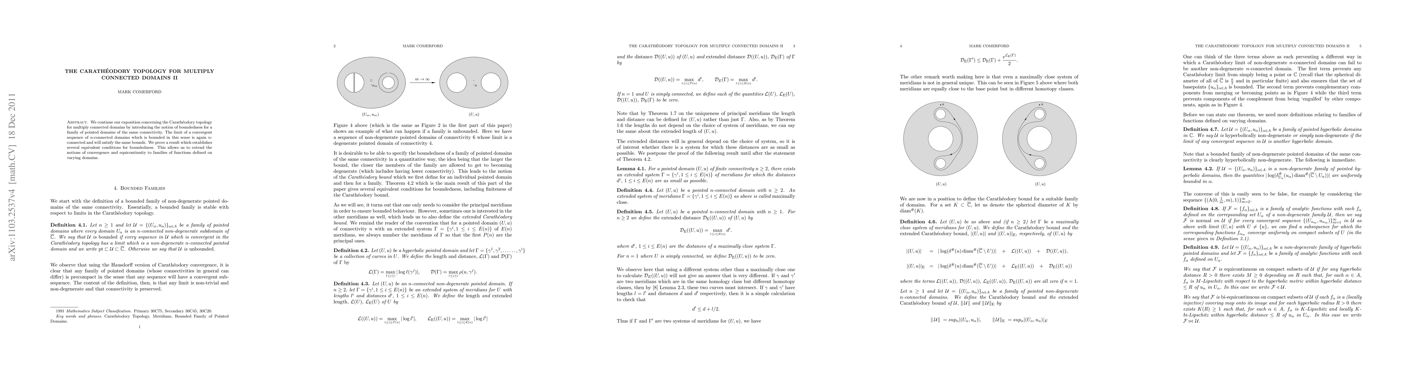 This paper extends the Caratheodory topology to multiply connected domains by defining boundedness for families of pointed domains. It proves that the limit of a bounded sequence of n-connected domains remains n-connected and bounded, establishing equivalent conditions for boundedness and extending convergence and equicontinuity to function families across varying domains.