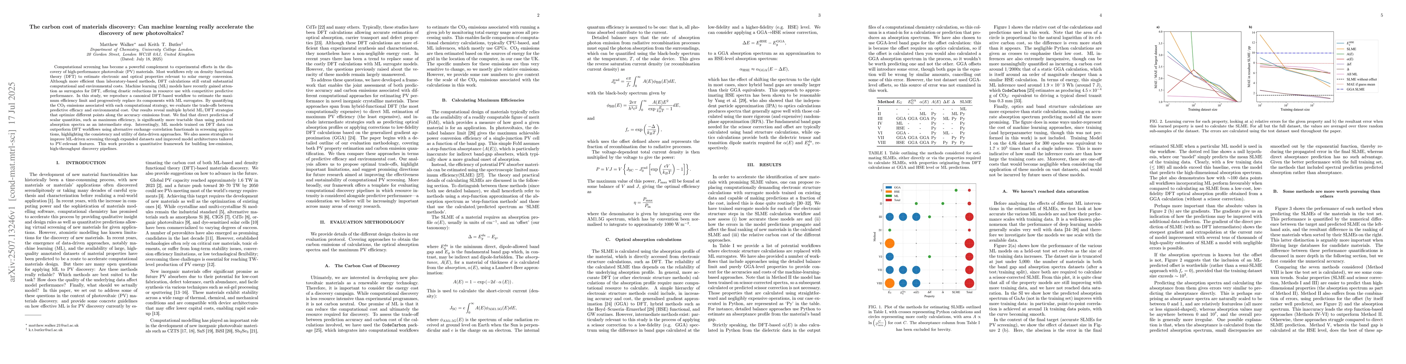 Computational screening has become a powerful complement to experimental efforts in the discovery of high-performance photovoltaic (PV) materials. Most workflows rely on density functional theory (DFT) to estimate electronic and optical properties relevant to solar energy conversion. Although more efficient than laboratory-based methods, DFT calculations still entail substantial computational and environmental costs. Machine learning (ML) models have recently gained attention as surrogates for DFT, offering drastic reductions in resource use with competitive predictive performance. In this study, we reproduce a canonical DFT-based workflow to estimate the maximum efficiency limit and progressively replace its components with ML surrogates. By quantifying the CO$_2$ emissions associated with each computational strategy, we evaluate the trade-offs between predictive efficacy and environmental cost. Our results reveal multiple hybrid ML/DFT strategies that optimize different points along the accuracy--emissions front. We find that direct prediction of scalar quantities, such as maximum efficiency, is significantly more tractable than using predicted absorption spectra as an intermediate step. Interestingly, ML models trained on DFT data can outperform DFT workflows using alternative exchange--correlation functionals in screening applications, highlighting the consistency and utility of data-driven approaches. We also assess strategies to improve ML-driven screening through expanded datasets and improved model architectures tailored to PV-relevant features. This work provides a quantitative framework for building low-emission, high-throughput discovery pipelines.