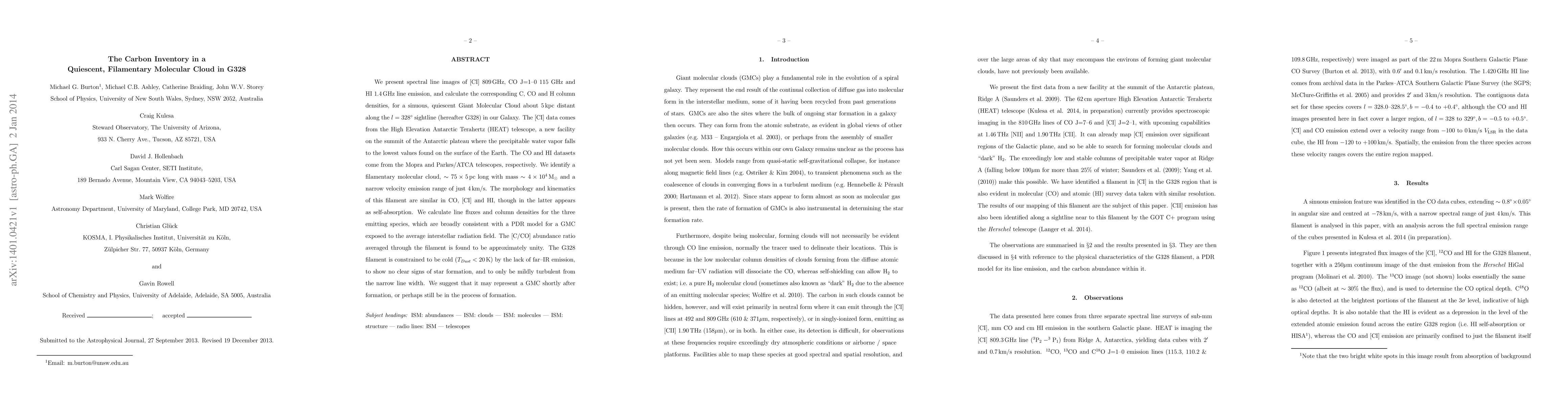 We present spectral line images of [CI] 809 GHz, CO J=1-0 115 GHz and HI 1.4 GHz line emission, and calculate the corresponding C, CO and H column densities, for a sinuous, quiescent Giant Molecular Cloud about 5 kpc distant along the l=328{\deg} sightline (hereafter G328) in our Galaxy. The [CI] data comes from the High Elevation Antarctic Terahertz (HEAT) telescope, a new facility on the summit of the Antarctic plateau where the precipitable water vapor falls to the lowest values found on the surface of the Earth. The CO and HI datasets come from the Mopra and Parkes/ATCA telescopes, respectively. We identify a filamentary molecular cloud, ~75 x 5 pc long with mass ~4 x 10E4 Msun and a narrow velocity emission range of just 4 km/s. The morphology and kinematics of this filament are similar in CO, [CI] and HI, though in the latter appears as self-absorption. We calculate line fluxes and column densities for the three emitting species, which are broadly consistent with a PDR model for a GMC exposed to the average interstellar radiation field. The [C/CO] abundance ratio averaged through the filament is found to be approximately unity. The G328 filament is constrained to be cold (Tdust < 20K) by the lack of far-IR emission, to show no clear signs of star formation, and to only be mildly turbulent from the narrow line width. We suggest that it may represent a GMC shortly after formation, or perhaps still be in the process of formation.