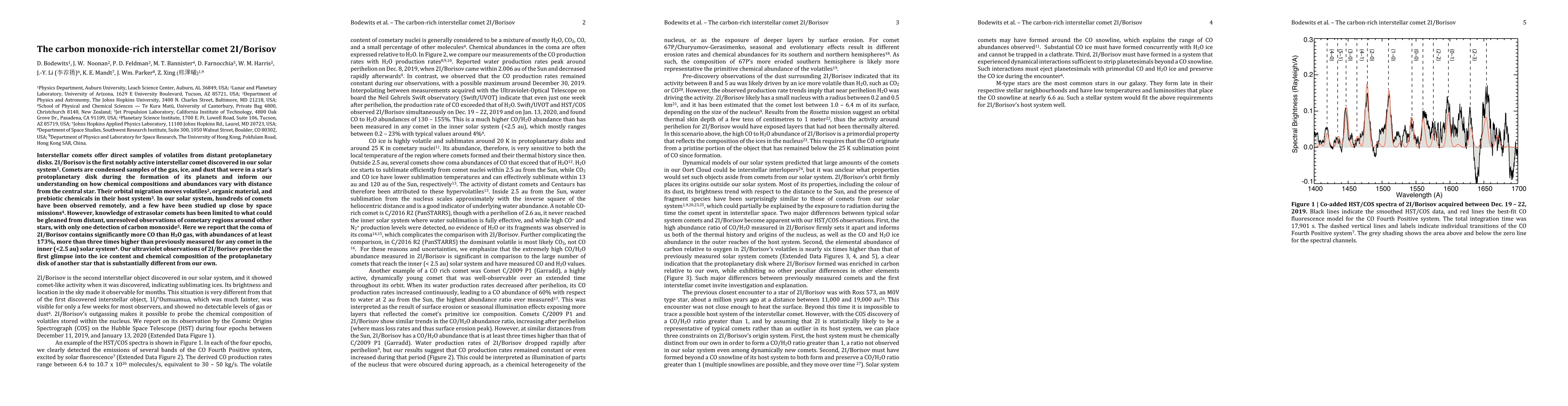The interstellar comet 2I/Borisov contains significantly more carbon monoxide (CO) than water (H2O), revealing a chemical composition substantially different from comets in our solar system. This discovery provides insights into the volatiles of another star's protoplanetary disk.