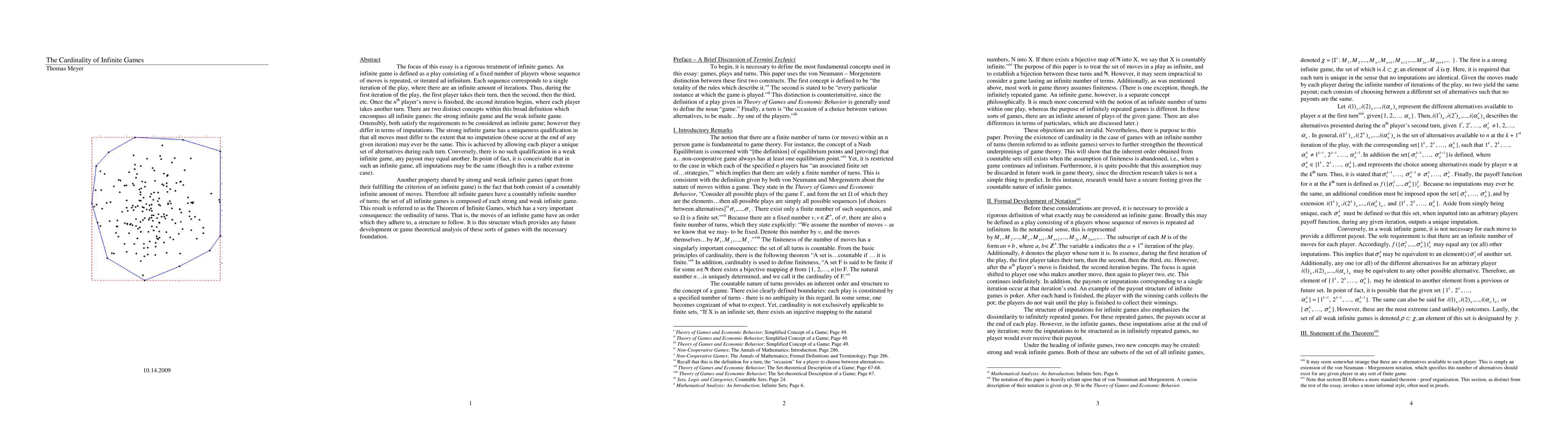 The focus of this essay is a rigorous treatment of infinite games. An infinite game is defined as a play consisting of a fixed number of players whose sequence of moves is repeated, or iterated ad infinitum. Each sequence corresponds to a single iteration of the play, where there are an infinite amount of iterations. There are two distinct concepts within this broad definition which encompass all infinite games: the strong infinite game and the weak infinite game. Both differ in terms of imputations. The strong infinite game has a uniqueness qualification in that all moves must differ to the extent that no imputation (these occur at the end of any given iteration) may ever be the same. Conversely, there is no such qualification in a weak infinite game, any payout may equal another. Another property shared by strong and weak infinite games (apart from their fulfilling the criterion of an infinite game) is the fact that both consist of a countably infinite amount of moves. Therefore all infinite games have a countably infinite number of turns; the set of all infinite games is composed of each strong and weak infinite game. This result has a very important consequence: the ordinality of turns. That is, the moves of an infinite game have an order or structure which they adhere to. It is this structure which provides any future development or game theoretical analysis of these sorts of games with the necessary foundation.