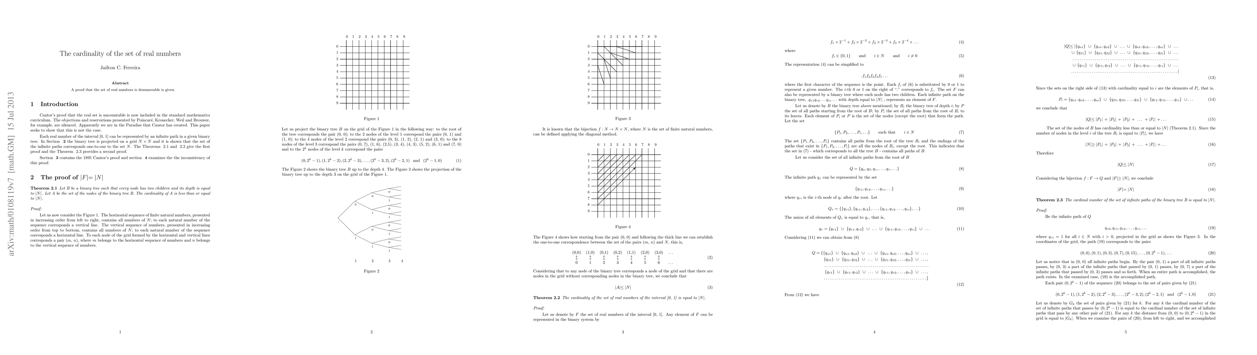 Summary: The paper presents a proof demonstrating that the set of real numbers is uncountable, contradicting the notion of it being denumerable. This establishes the cardinality of real numbers as greater than that of any countable set.