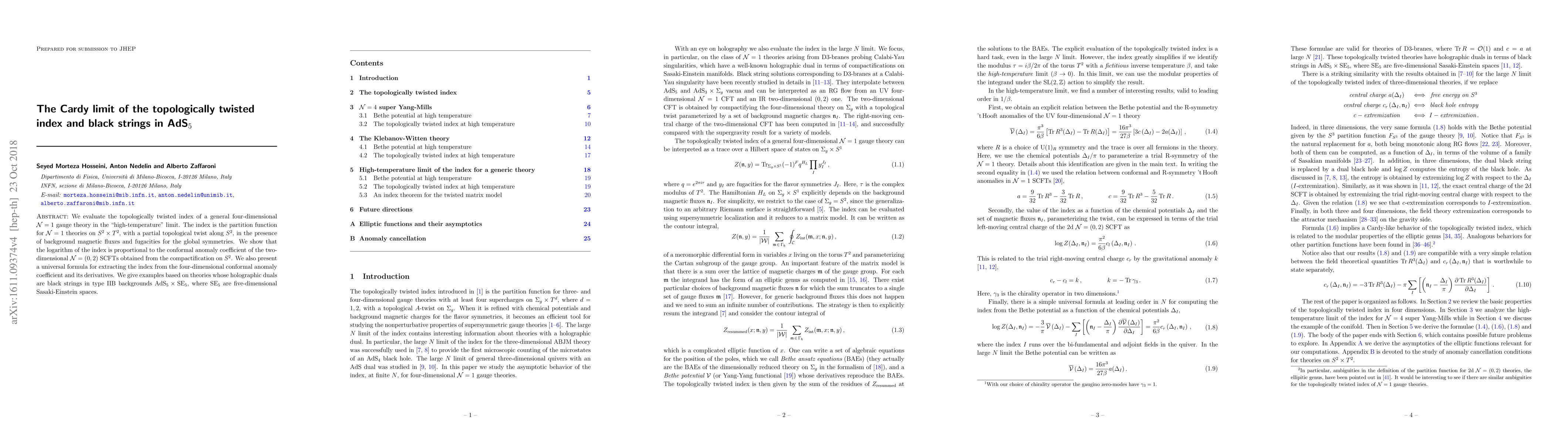 We evaluate the topologically twisted index of a general four-dimensional $\mathcal{N} = 1$ gauge theory in the "high-temperature" limit. The index is the partition function for $\mathcal{N} = 1$ theories on $S^2 \times T^2$, with a partial topological twist along $S^2$, in the presence of background magnetic fluxes and fugacities for the global symmetries. We show that the logarithm of the index is proportional to the conformal anomaly coefficient of the two-dimensional $\mathcal{N} = (0,2)$ SCFTs obtained from the compactification on $S^2$. We also present a universal formula for extracting the index from the four-dimensional conformal anomaly coefficient and its derivatives. We give examples based on theories whose holographic duals are black strings in type IIB backgrounds AdS$_5 \times \text{SE}_5$, where SE$_5$ are five-dimensional Sasaki-Einstein spaces.