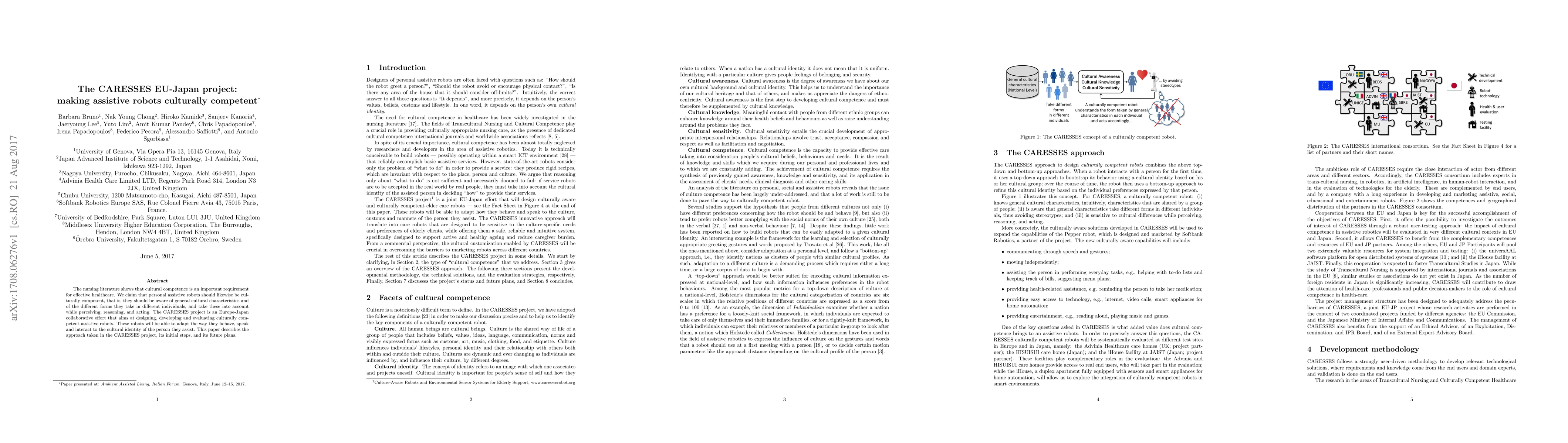 The nursing literature shows that cultural competence is an important requirement for effective healthcare. We claim that personal assistive robots should likewise be culturally competent, that is, they should be aware of general cultural characteristics and of the different forms they take in different individuals, and take these into account while perceiving, reasoning, and acting. The CARESSES project is an Europe-Japan collaborative effort that aims at designing, developing and evaluating culturally competent assistive robots. These robots will be able to adapt the way they behave, speak and interact to the cultural identity of the person they assist. This paper describes the approach taken in the CARESSES project, its initial steps, and its future plans.