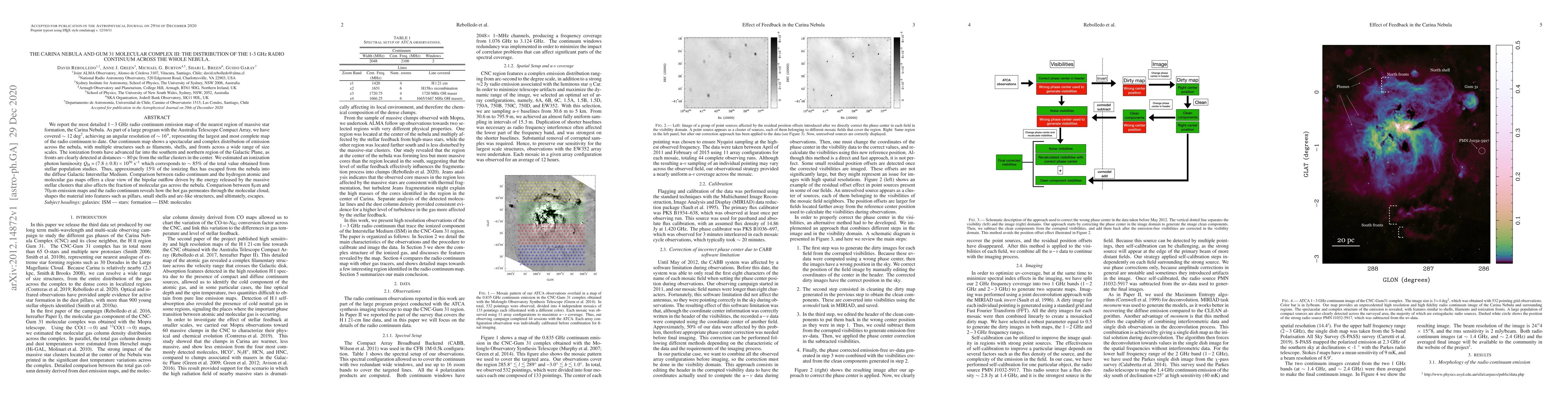 This paper presents a detailed 1-3 GHz radio continuum map of the Carina Nebula, revealing complex structures like filaments and shells. The study estimates an ionization photon luminosity, showing that 15% of the ionizing flux escapes into the interstellar medium, highlighting the impact of massive stars on the surrounding gas.