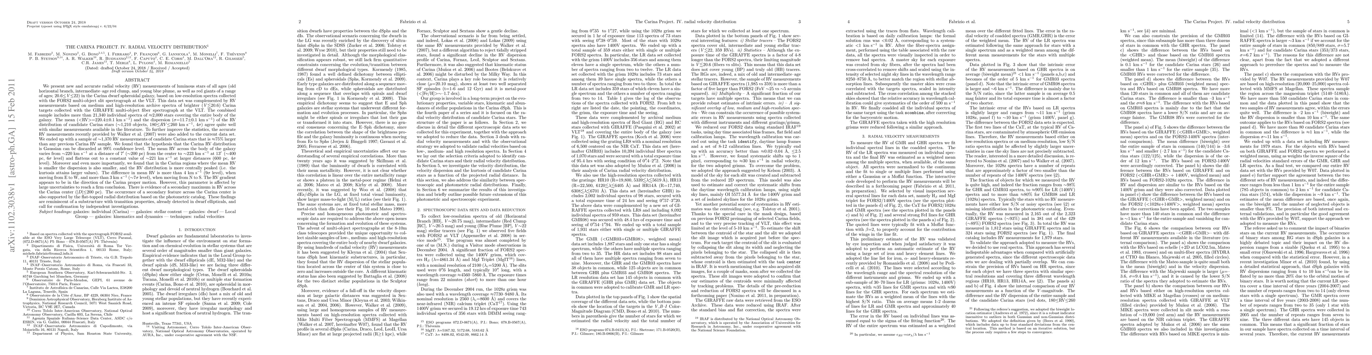 This study presents a comprehensive radial velocity (RV) dataset for luminous stars across various ages in the Carina dwarf galaxy, revealing a mean RV of approximately 221 km/s at larger distances and a secondary RV maximum near the galaxy's center. The RV dispersion is smaller in regions with lower mean RV, indicating a more centrally peaked RV distribution.