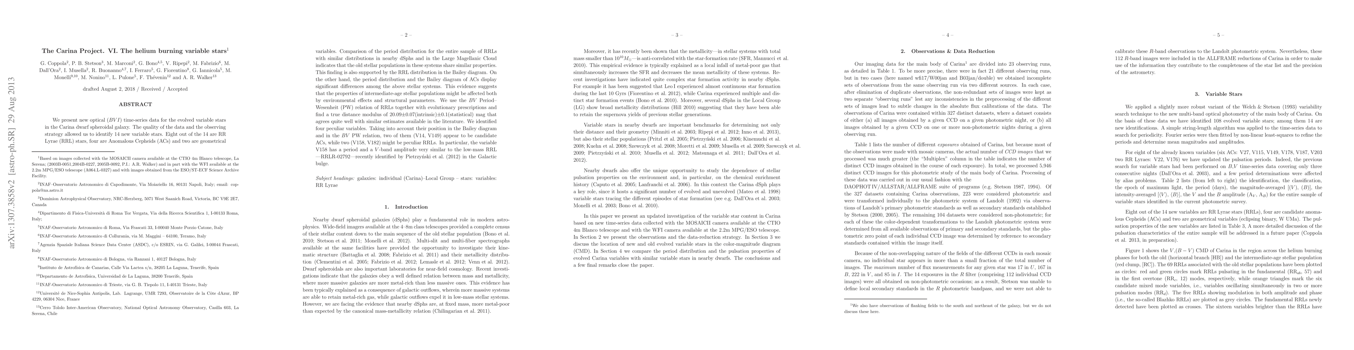 We present new optical (BVI) time-series data for the evolved variable stars in the Carina dwarf spheroidal galaxy. The quality of the data and the observing strategy allowed us to identify 14 new variable stars. Eight out of the 14 are RR Lyrae (RRL) stars, four are Anomalous Cepheids (ACs) and two are geometrical variables. Comparison of the period distribution for the entire sample of RRLs with similar distributions in nearby dSphs and in the Large Magellanic Cloud indicates that the old stellar populations in these systems share similar properties. This finding is also supported by the RRL distribution in the Bailey diagram. On the other hand, the period distribution and the Bailey diagram of ACs display significant differences among the above stellar systems. This evidence suggests that the properties of intermediate-age stellar populations might be affected both by environmental effects and structural parameters. We use the BV Period--Wesenheit (PW) relation of RRLs together with evolutionary prescriptions and find a true distance modulus of 20.09+/-0.07(intrinsic)+/-0.1(statistical) mag that agrees quite well with similar estimates available in the literature. We identified four peculiar variables. Taking into account their position in the Bailey diagram and in the BV PW relation, two of them (V14, V149) appear to be candidate ACs, while two (V158, V182) might be peculiar RRLs. In particular, the variable V158 has a period and a V-band amplitude very similar to the low-mass RRL ---RRLR-02792---recently identified by Pietrzynski at al. (2012) in the Galactic bulge.