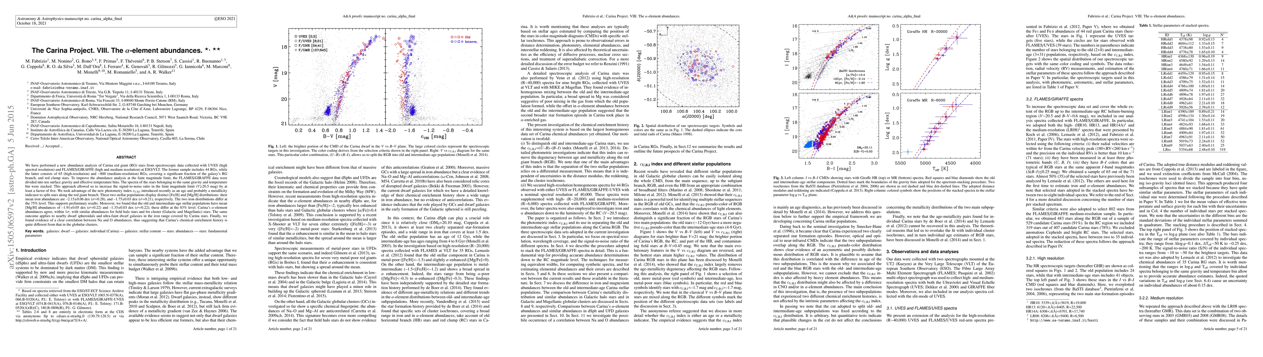 We have performed a new abundance analysis of Carina Red Giant (RG) stars from spectroscopic data collected with UVES (high resolution) and FLAMES/GIRAFFE (high and medium resolution) at ESO/VLT. The former sample includes 44 RGs, while the latter consists of 65 (high) and ~800 (medium resolution) RGs, covering a significant fraction of the galaxy's RG branch (RGB), and red clump stars. To improve the abundance analysis at the faint magnitude limit, the FLAMES/GIRAFFE data were divided into ten surface gravity and effective temperature bins. The spectra of the stars belonging to the same gravity/temperature bin were stacked. This approach allowed us to increase by at least a factor of five the signal-to-noise ratio in the faint limit (V>20.5mag). We took advantage of the new photometry index cU,B,I introduced by Monelli et al. (2014), as an age and probably a metallicity indicator, to split stars along the RGB. These two stellar populations display distinct [Fe/H] and [Mg/H] distributions: their mean Fe abundances are -2.15$\pm$0.06dex (sig=0.28), and -1.75$\pm$0.03dex (sig=0.21), respectively. The two iron distributions differ at the 75% level. This supports preliminary results by Lemasle et al. (2012) and by Monelli et al. (2014). Moreover, we found that the old and intermediate-age stellar populations have mean [Mg/H] abundances of -1.91$\pm$0.05dex (sig=0.22) and -1.35$\pm$0.03dex (sig=0.22); these differ at the 83% level. Carina's {\alpha}-element abundances agree, within 1sigma, with similar abundances for field Halo stars and for cluster (Galactic, Magellanic) stars. The same outcome applies to nearby dwarf spheroidals and ultra-faint dwarf galaxies, in the iron range covered by Carina stars. Finally, we found evidence of a clear correlation between Na and O abundances, thus suggesting that Carina's chemical enrichment history is quite different than in the globular clusters.