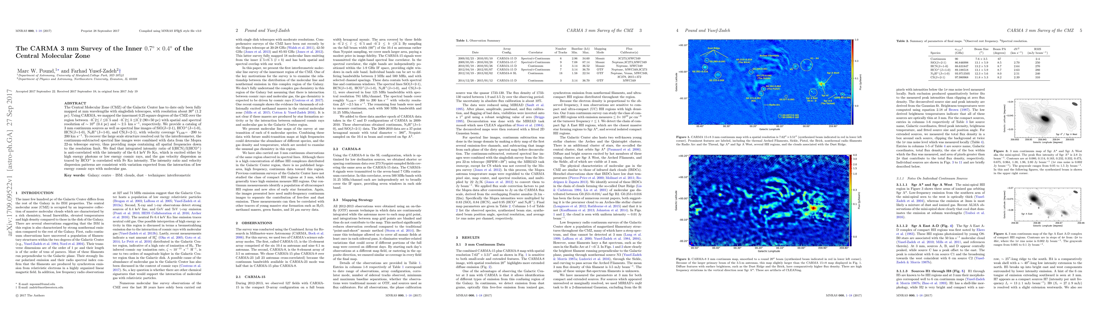 This study mapped a detailed 3mm survey of the Galactic Center's Central Molecular Zone with CARMA, revealing correlations between molecular gas properties and high-energy radiation sources, shedding light on the interaction between low-energy cosmic rays and molecular gas.