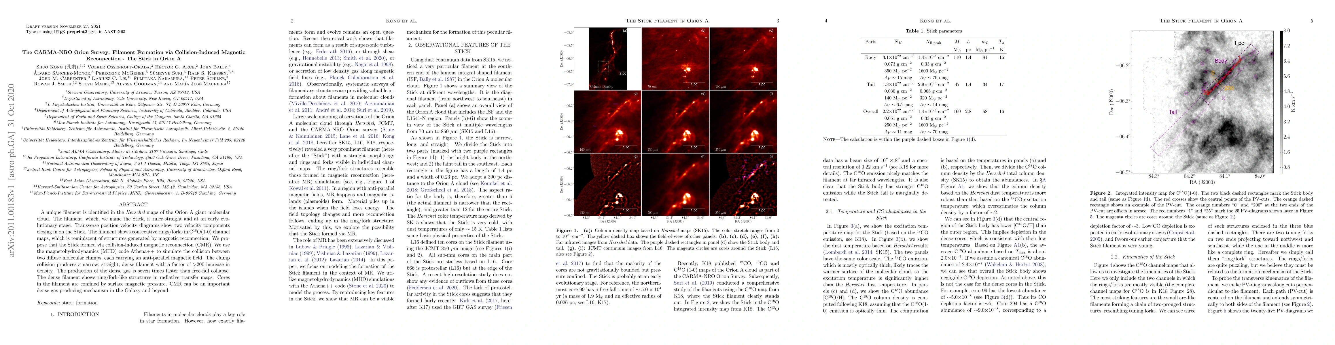The CARMA-NRO Orion Survey identifies a straight filament in Orion A, termed the Stick, formed via collision-induced magnetic reconnection. Simulations using the Athena++ MHD code confirm the rapid production of dense gas and ring/fork structures, suggesting magnetic reconnection as a significant mechanism for filament formation.