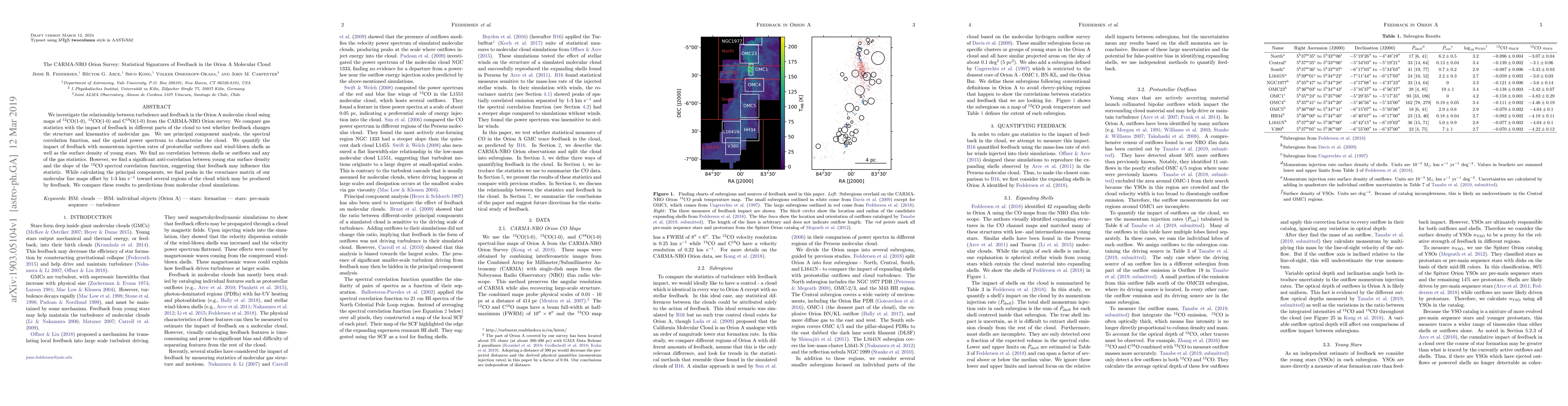 The study investigates the relationship between turbulence and feedback in the Orion A molecular cloud using $^{12}$CO(1-0), $^{13}$CO(1-0), and C$^{18}$O(1-0) maps from the CARMA-NRO Orion survey. It employs principal component analysis, the spectral correlation function (SCF), and the spatial power spectrum (SPS) to characterize the cloud and quantify feedback impact.