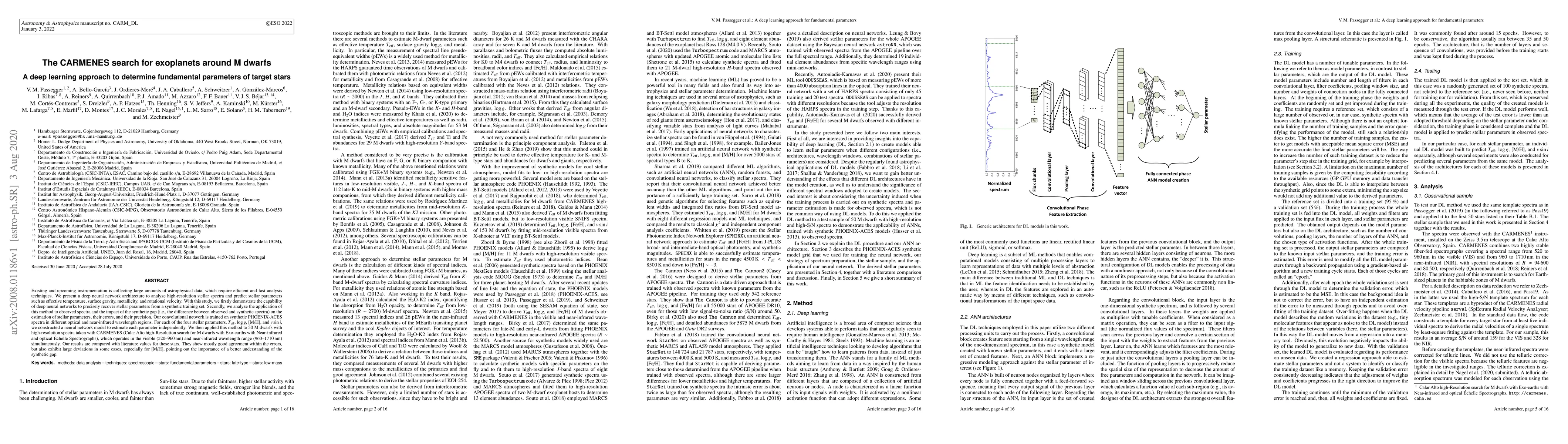 This paper introduces a deep neural network to analyze high-resolution stellar spectra and predict stellar parameters. The network, trained on synthetic PHOENIX-ACES spectra, shows good agreement with literature values for 50 M dwarfs observed with CARMENES, though it highlights significant discrepancies in metallicity estimations, emphasizing the need for better synthetic data models.