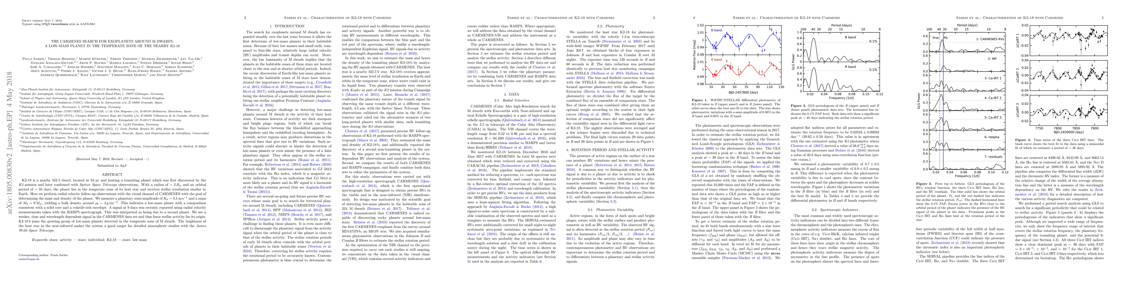 The CARMENES search identifies a low-mass planet, K2-18b, around the M2.5 dwarf K2-18, with a mass of approximately 9 Earth masses and a radius of about 2 Earth radii, located in the temperate zone. The planet's density suggests a composition with a solid core and a volatile-rich envelope.