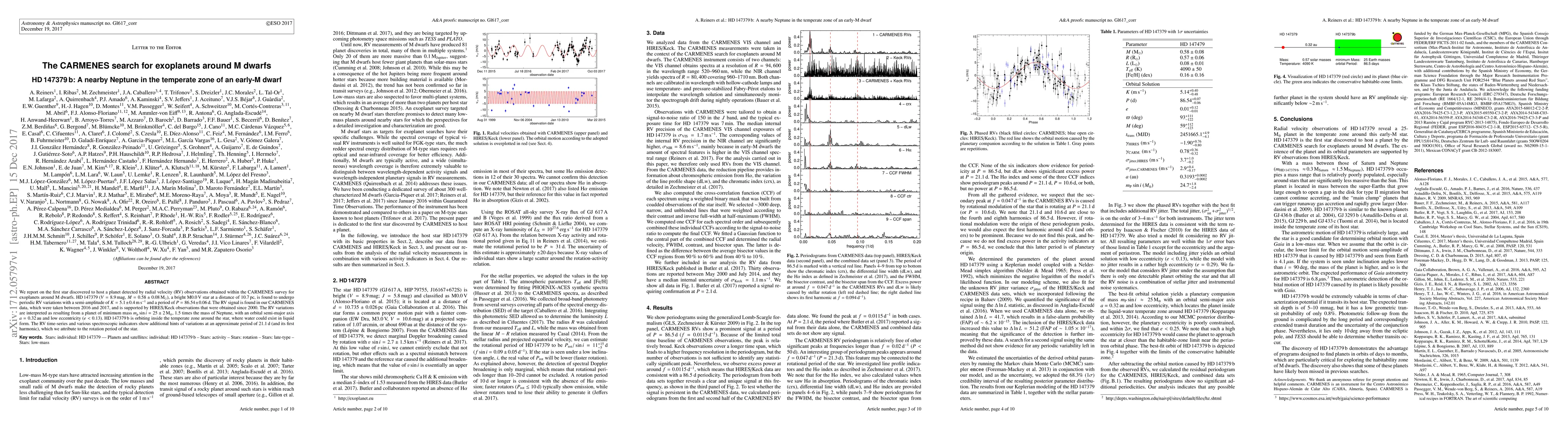 The CARMENES survey discovered HD 147379b, a Neptune-sized exoplanet orbiting an early-M dwarf star, with a period of 86.54 days and a mass 1.5 times that of Neptune, located within the star's temperate zone. Additional variations suggest the star's rotation period may be around 21.1 days.