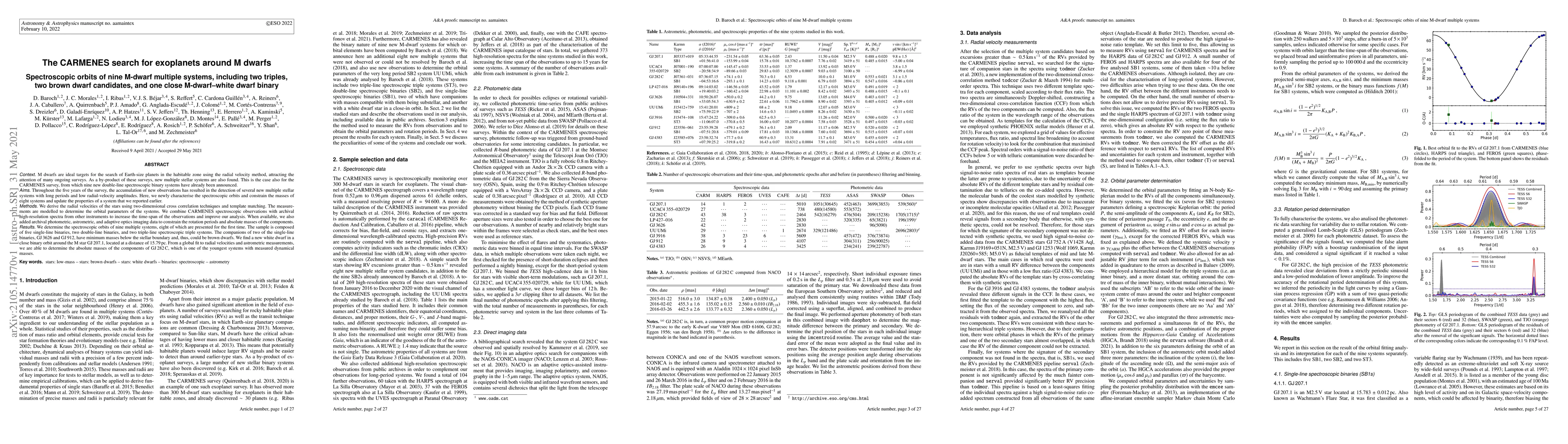 This paper reports the spectroscopic orbits of nine M-dwarf multiple systems detected by the CARMENES survey, including two triples, two potential brown dwarf candidates, and a close M-dwarf-white dwarf binary. The study uses radial velocity measurements and combines data from various sources to determine the orbital parameters and masses of the systems.