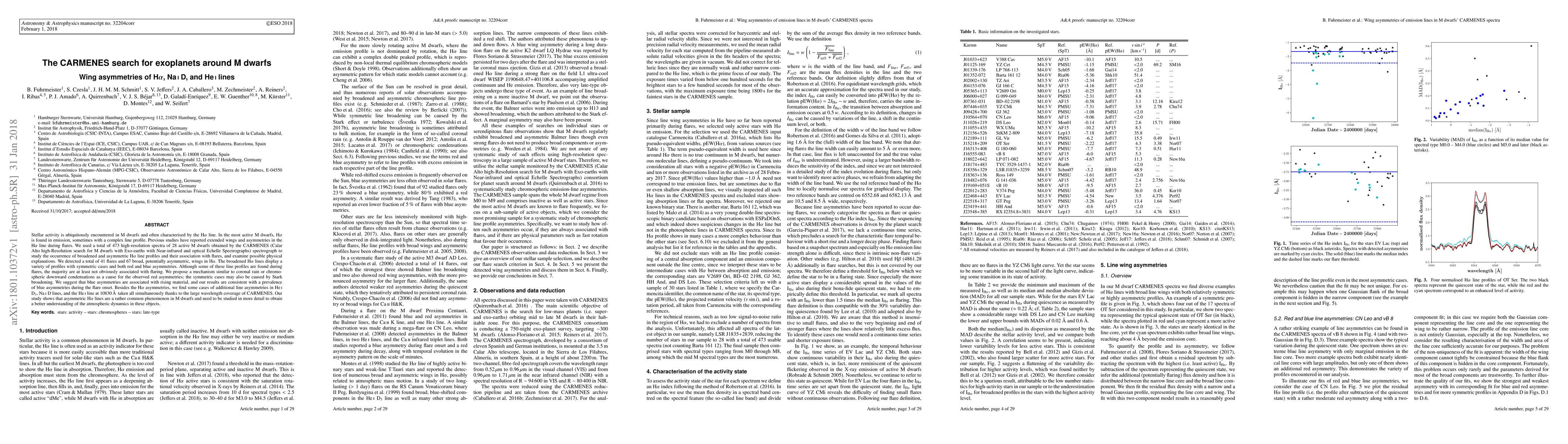 Stellar activity is ubiquitously encountered in M dwarfs and often characterised by the H$\alpha$ line. In the most active M dwarfs, H$\alpha$ is found in emission, sometimes with a complex line profile. Previous studies have reported extended wings and asymmetries in the H$\alpha$ line during flares. We used a total of 473 high-resolution spectra of 28 active M dwarfs obtained by the CARMENES (Calar Alto high-Resolution search for M dwarfs with Exo-earths with Near-infrared and optical Echelle Spectrographs) spectrograph to study the occurrence of broadened and asymmetric H$\alpha$ line profiles and their association with flares, and examine possible physical explanations. We detected a total of 41 flares and 67 broad, potentially asymmetric, wings in H$\alpha$. The broadened H$\alpha$ lines display a variety of profiles with symmetric cases and both red and blue asymmetries. Although some of these line profiles are found during flares, the majority are at least not obviously associated with flaring. We propose a mechanism similar to coronal rain or chromospheric downward condensations as a cause for the observed red asymmetries; the symmetric cases may also be caused by Stark broadening. We suggest that blue asymmetries are associated with rising material, and our results are consistent with a prevalence of blue asymmetries during the flare onset. Besides the H$\alpha$ asymmetries, we find some cases of additional line asymmetries in \ion{He}{i} D$_{3}$, \ion{Na}{i}~D lines, and the \ion{He}{i} line at 10830\,\AA\, taken all simultaneously thanks to the large wavelength coverage of CARMENES. Our study shows that asymmetric H$\alpha$ lines are a rather common phenomenon in M~dwarfs and need to be studied in more detail to obtain a better understanding of the atmospheric dynamics in these objects.