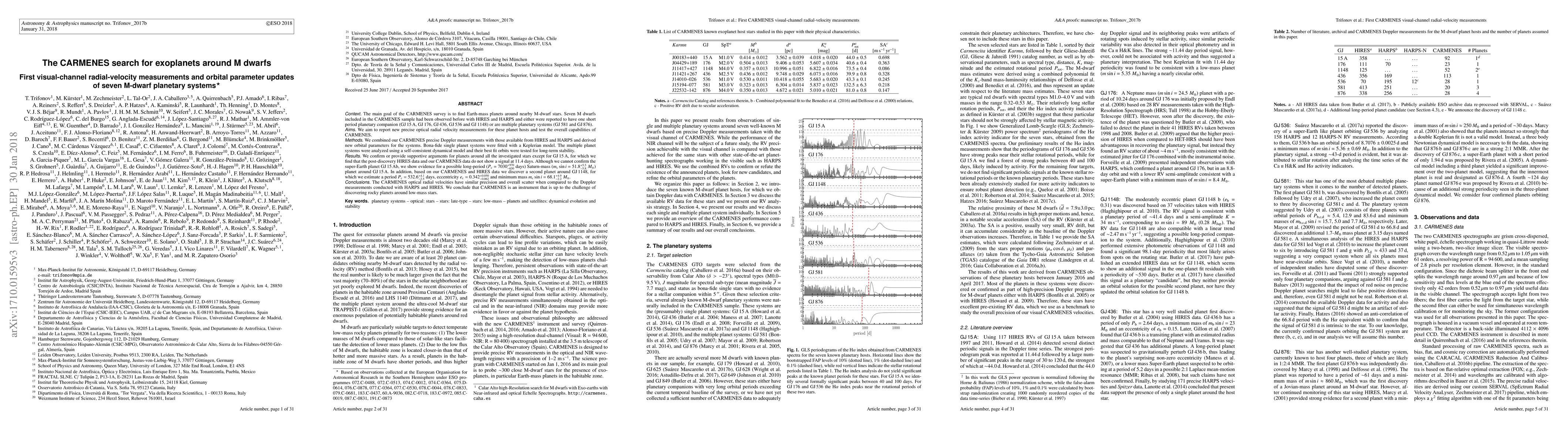 The CARMENES survey aims to find Earth-mass planets around nearby M-dwarf stars. New radial velocity measurements confirm or suggest planets around six of seven surveyed M-dwarfs, including a possible long-period Saturn-mass planet around GJ15A and a second planet in the GJ1148 system. CARMENES demonstrates comparable precision to previous instruments, confirming its capability for detecting rocky planets.