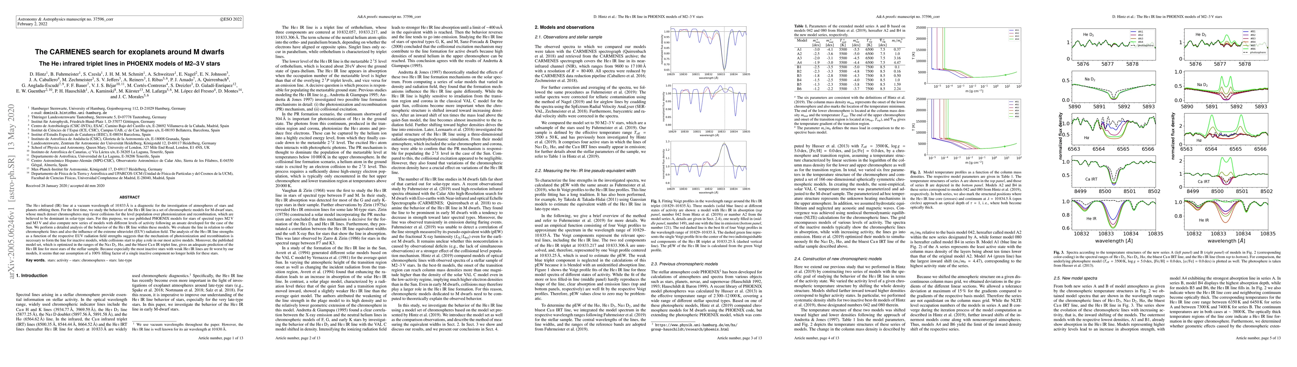 This paper investigates the behavior of the He I infrared line in M-dwarf stars using PHOENIX models, finding that photoionization and recombination dominate in inactive stars, while collisions become significant in more active models. The study suggests that the published model set accurately predicts the He I IR line for most stars, but struggles with the weakest lines in the least active stars.