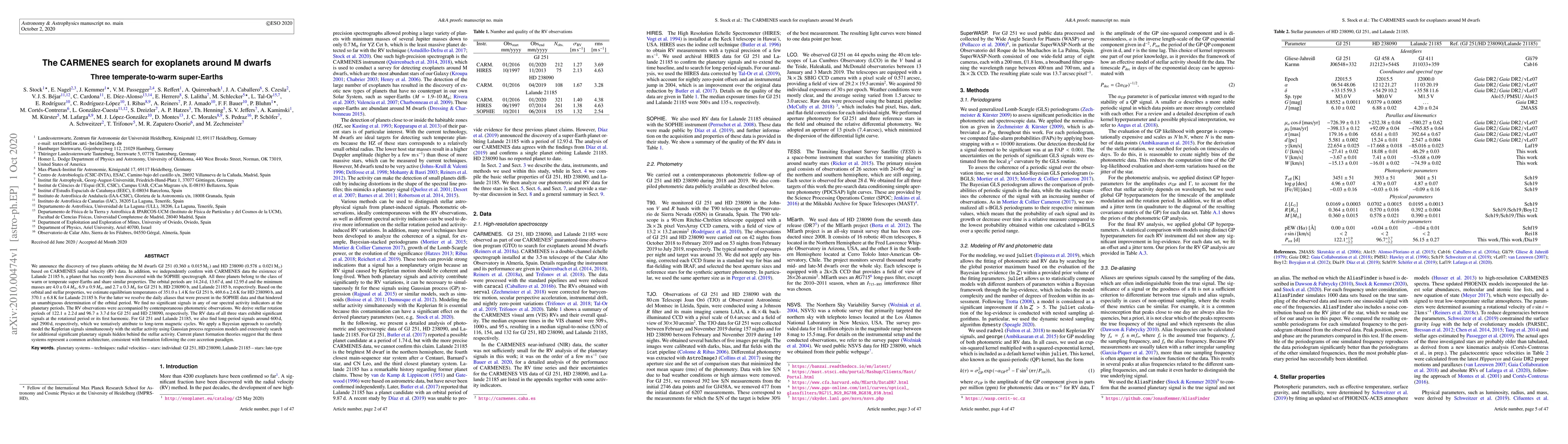 The CARMENES search discovers three temperate to warm super-Earths orbiting M dwarfs GJ 251, HD 238090, and Lalande 21185, with orbital periods of 14.24, 13.67, and 12.95 days respectively, and resolves daily aliases in Lalande 21185 b's data.