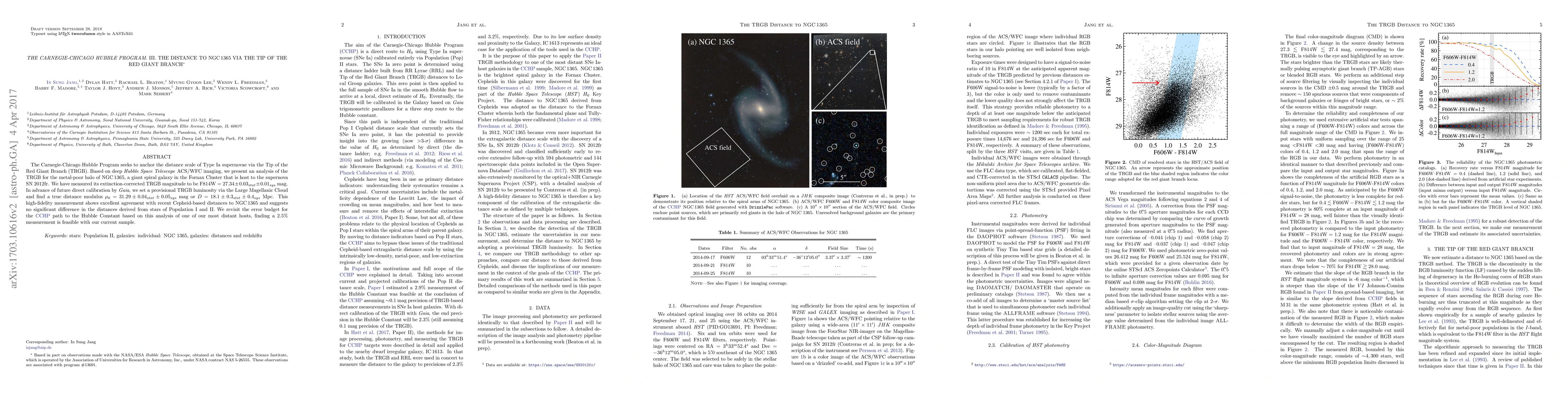 The Carnegie-Chicago Hubble Program measures the distance to NGC 1365 using the Tip of the Red Giant Branch (TRGB) method, yielding a distance modulus of 31.29 ± 0.04 mag, corresponding to a distance of 18.1 ± 0.3 Mpc, showing agreement with Cepheid-based distances and suggesting no significant difference between Population I and II stars.