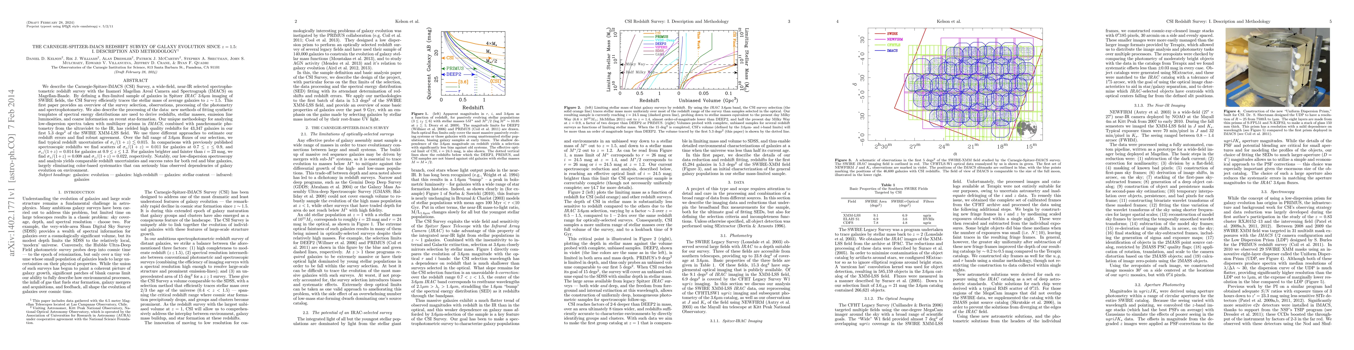 The Carnegie-Spitzer-IMACS (CSI) Survey is a near-IR selected spectrophotometric redshift survey that traces galaxy stellar mass up to z~1.5. It employs IMACS on the Magellan-Baade telescope and uses Spitzer imaging to select galaxies, achieving high-quality redshifts for 43,347 galaxies with robust error estimates and minimal color-based systematic biases.