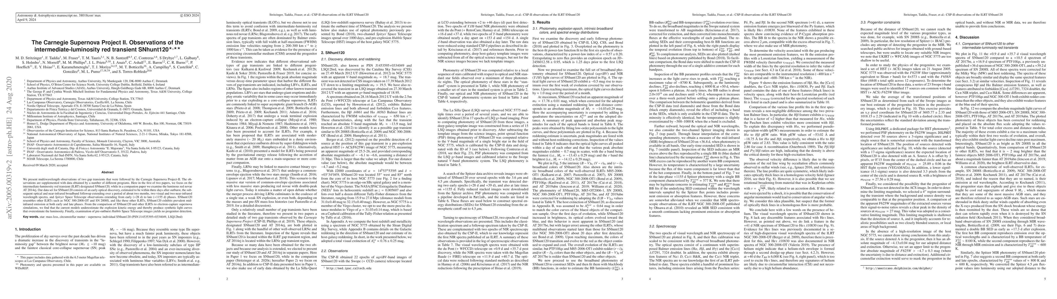 We present multi-wavelength observations of two gap transients followed by the Carnegie Supernova Project-II and supplemented with data obtained by a number of different programs. Here in the first of two papers, we focus on the intermediate luminosity red transient (ILRT) designated SNhunt120, while in a companion paper we examine the luminous red novae AT 2014ej. Our data set for SNhunt120 consists of an early optical discovery, estimated to be within 3 days after outburst, the subsequent optical and near-infrared broadband followup extending over a $\sim$2 month period, two visual- and two near-infrared wavelength spectra, and Spitzer Space Telescope observations extending from early ($+$28 d) to late ($+$1155 d) phases. SNhunt120 resembles other ILRTs such as NGC 300-2008-OT and SN 2008S, and like these other ILRTs, SNhunt120 exhibits prevalent mid-infrared emission at both early and late phases. From the comparison of SNhunt120 and other ILRTs to electron-capture supernova simulations, we find that the current models underestimate the explosion kinetic energy and thereby produce synthetic light curves that over-estimate the luminosity. Finally, examination of pre-outburst Hubble Space Telescope images yields no progenitor detection.