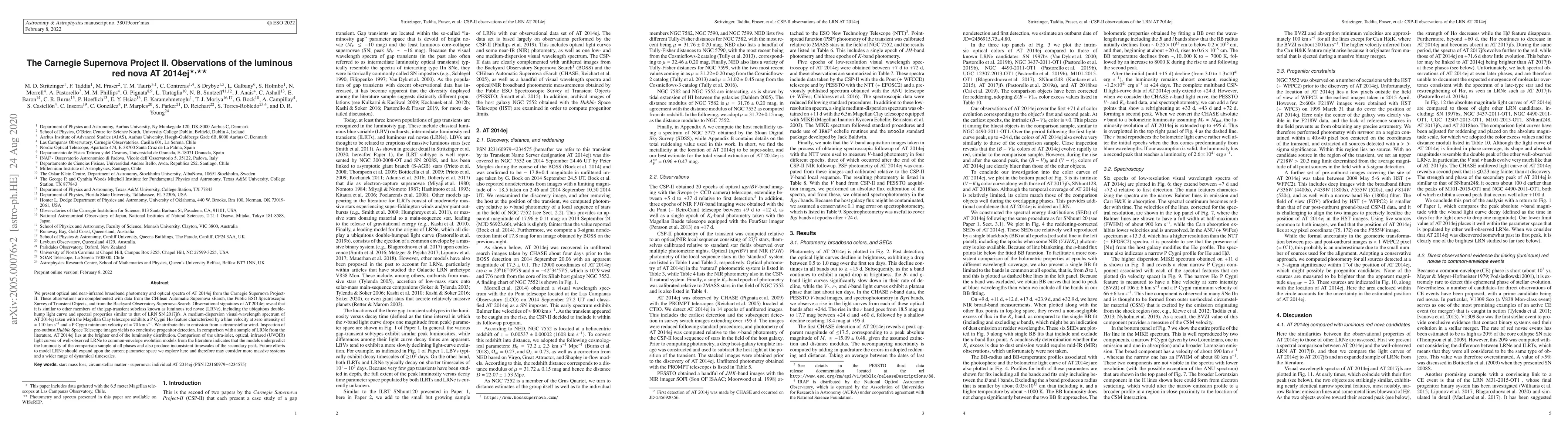 We present optical and near-infrared broadband photometry and optical spectra of AT 2014ej from the the Carnegie Supernova Project-II. These observations are complemented with data from the CHilean Automatic Supernova sEarch, the Public ESO Spectroscopic Survey of Transient Objects, and from the Backyard Observatory Supernova Search. Observational signatures of AT 2014ej reveal that it is similar to other members of the gap-transient subclass known as luminous red novae (LRNe), including the ubiquitous double hump light curve and spectral properties akin to the LRN SN 2017jfs. A medium-dispersion, visual-wavelength spectrum of AT 2014ej taken the Magellan Clay telescope, exhibits a P Cygni H$\alpha$ feature characterized by a blue velocity at zero intensity of $\approx 110$ km s$^{-1}$ and a P Cygni minimum velocity of $\approx70$ km s$^{-1}$, and which we attribute to emission from a circumstellar wind. Inspection of pre-outbust Hubble Space Telescope images yields no conclusive progenitor detection. In comparison with a sample of LRNe from the literature, AT 2014ej lies among the brighter end of the luminosity distribution. Comparison of the ultra-violet, optical, infrared (UVOIR) light curves of well-observed LRNe to common-envelope evolution models from the literature, indicates the models under predict the luminosity of the comparison sample at all phases and also produce inconsistent time-scales of the secondary peak. Future efforts to model LRNe should expand upon the current parameter space explored and therefore may consider more massive systems and a wider range of dynamical timescales.