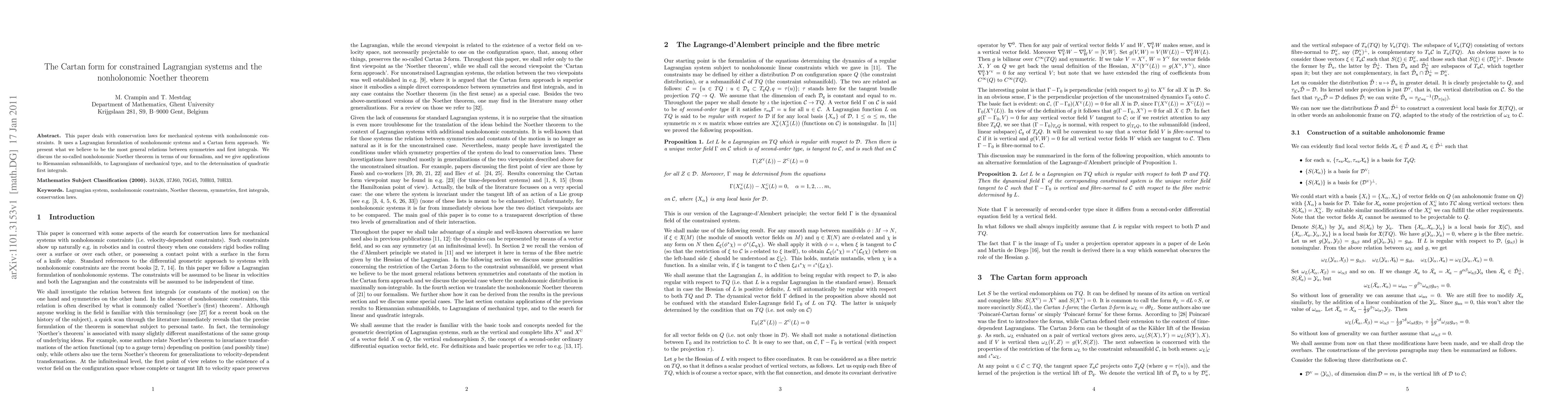 This paper explores conservation laws in mechanical systems with nonholonomic constraints using a Lagrangian formulation and Cartan form approach, presenting a generalized relation between symmetries and first integrals. It also discusses the nonholonomic Noether theorem and applies the formalism to Riemannian submanifolds and mechanical Lagrangians.
