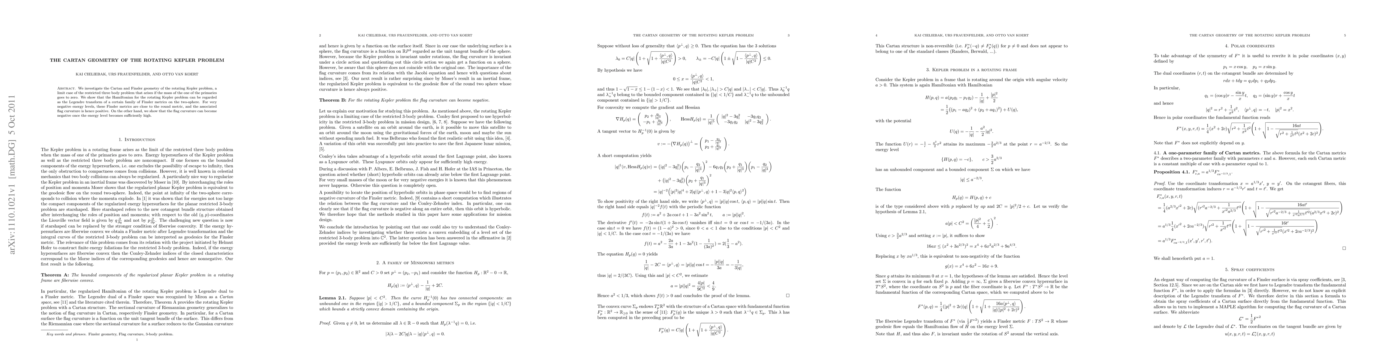 This paper explores the Cartan and Finsler geometries of the rotating Kepler problem, demonstrating that its Hamiltonian can be seen as the Legendre transform of Finsler metrics on the two-sphere. It finds that for low energy, these metrics approximate the round metric with positive flag curvature, but high energy levels can lead to negative flag curvature.