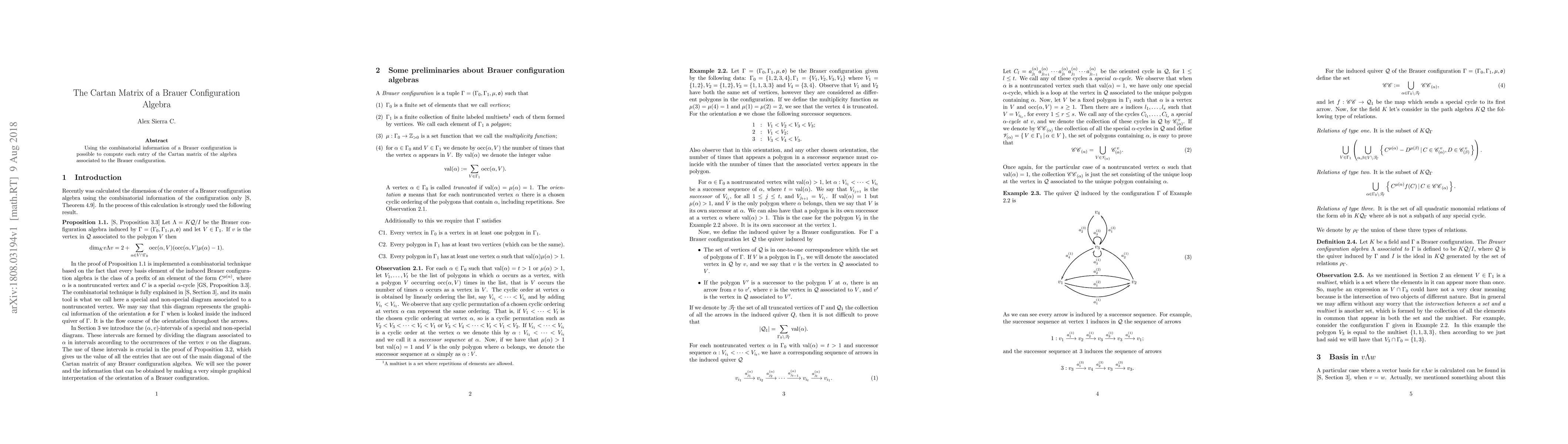 Summary: This paper explores how combinatorial data from a Brauer configuration can be utilized to determine the entries of the Cartan matrix for the corresponding configuration algebra. The methodology provides a systematic approach to compute the Cartan matrix based on the underlying structure of the Brauer configuration.