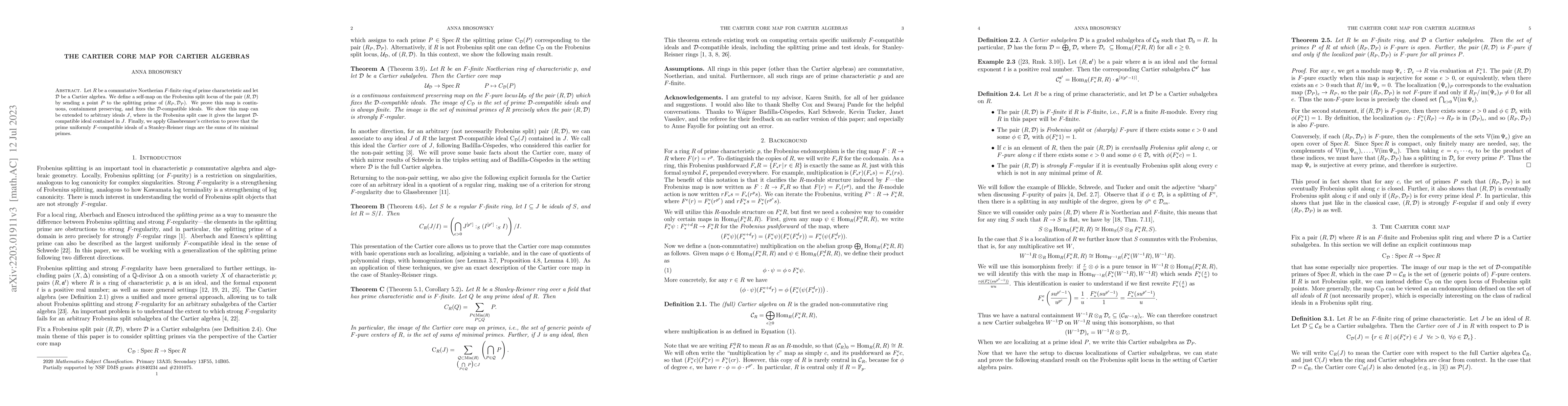 This paper defines a self-map on the Frobenius split locus of a Cartier algebra over a commutative Noetherian ring, proving its continuity and containment properties. It extends the map to arbitrary ideals, showing it yields the largest compatible ideal contained within, and applies this to Stanley-Reisner rings to identify prime uniformly $F$-compatible ideals.
