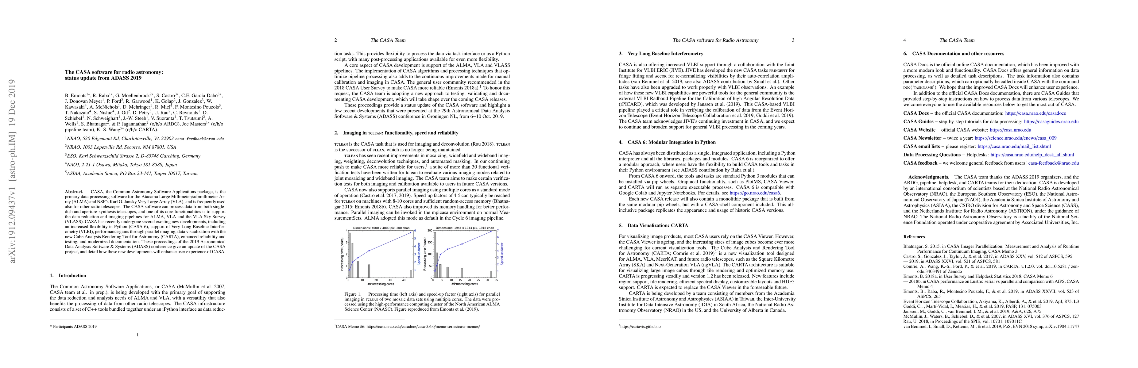 The CASA software, a primary data processing tool for ALMA and VLA, has seen significant updates including Python flexibility, VLBI support, parallel imaging, and improved documentation. These enhancements aim to boost the user experience and efficiency of radio astronomy data analysis.