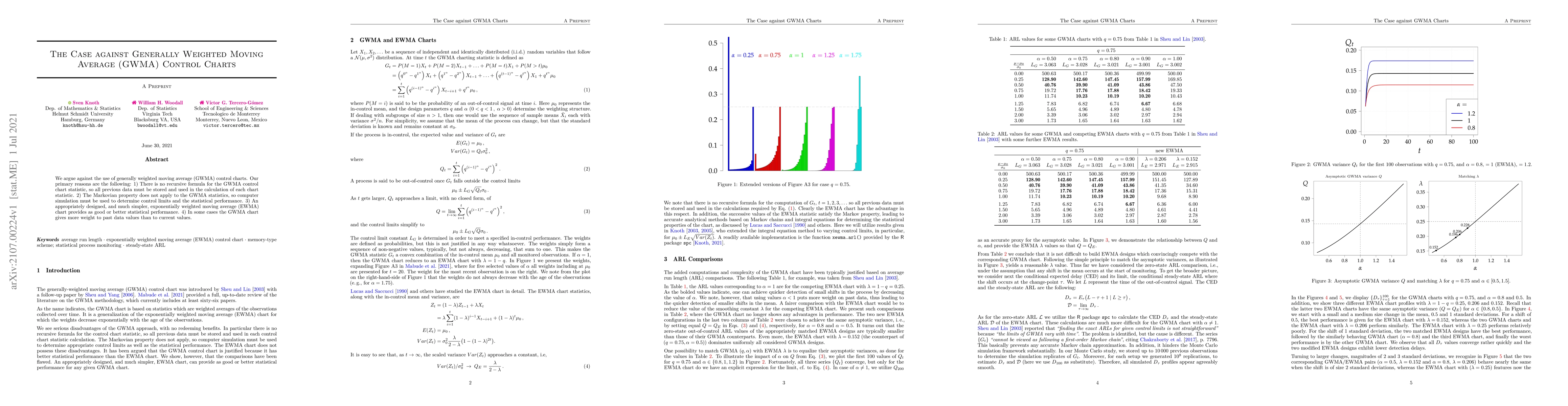Summary: This paper argues against the use of GWMA control charts due to the lack of a recursive formula, the necessity of computer simulation for determining control limits, the comparable or superior performance of simpler EWMA charts, and the potential for GWMA to overly emphasize past data over current values.