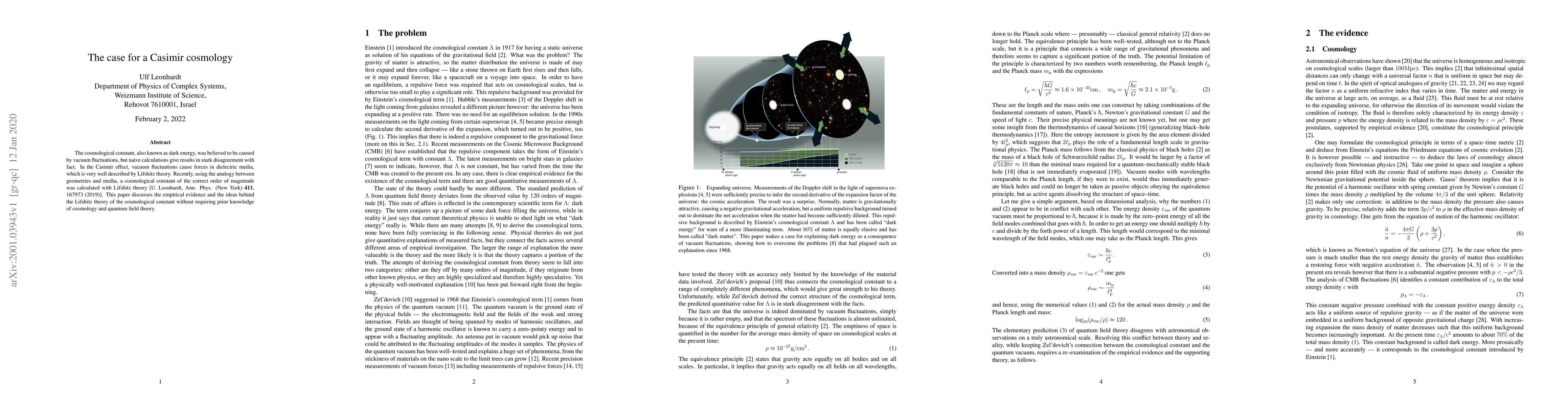 The cosmological constant, also known as dark energy, was believed to be caused by vacuum fluctuations, but naive calculations give results in stark disagreement with fact. In the Casimir effect, vacuum fluctuations cause forces in dielectric media, which is very well described by Lifshitz theory. Recently, using the analogy between geometries and media, a cosmological constant of the correct order of magnitude was calculated with Lifshitz theory [U. Leonhardt, Ann. Phys. (New York) 411, 167973 (2019)]. This paper discusses the empirical evidence and the ideas behind the Lifshitz theory of the cosmological constant without requiring prior knowledge of cosmology and quantum field theory.