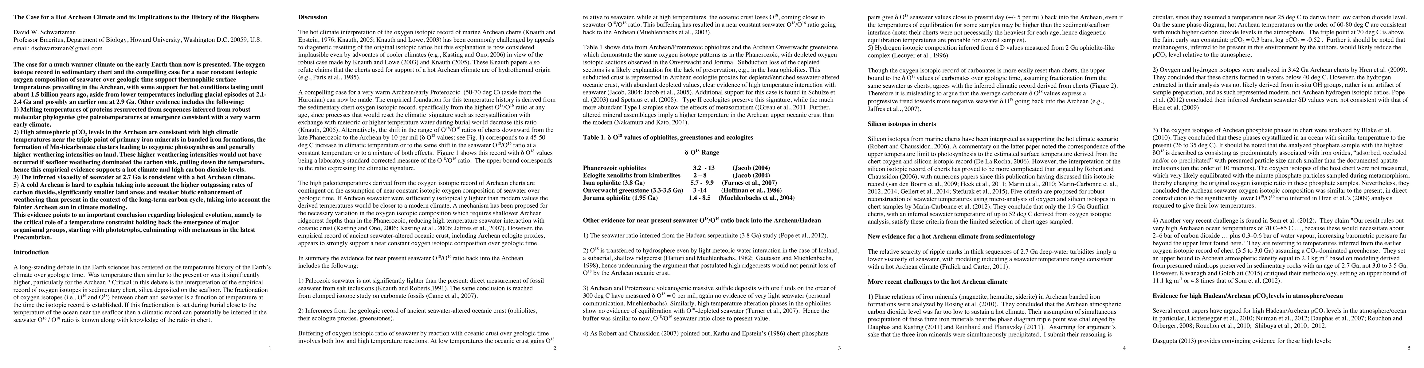 This paper argues for a significantly warmer Archean climate than present, supported by the oxygen isotope record, high atmospheric pCO2, and molecular phylogenetic evidence. It concludes that a hot climate was crucial for the evolution of early life, influencing the emergence of major organismal groups.