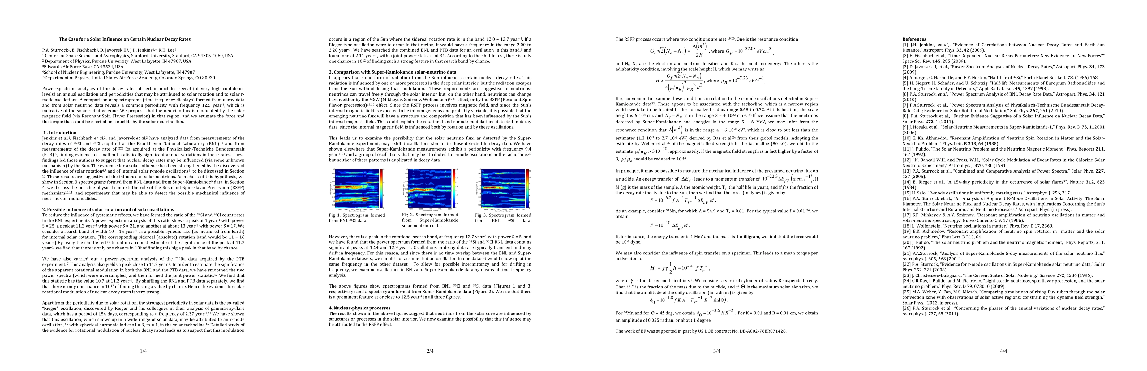 This paper presents evidence of annual oscillations and periodicities in nuclear decay rates that correlate with solar phenomena, suggesting a solar influence on certain nuclear decay rates. The study proposes that solar magnetic fields modulate the neutrino flux, exerting force and torque on nuclides, based on a 12.5-year periodicity found in both decay and solar neutrino data.