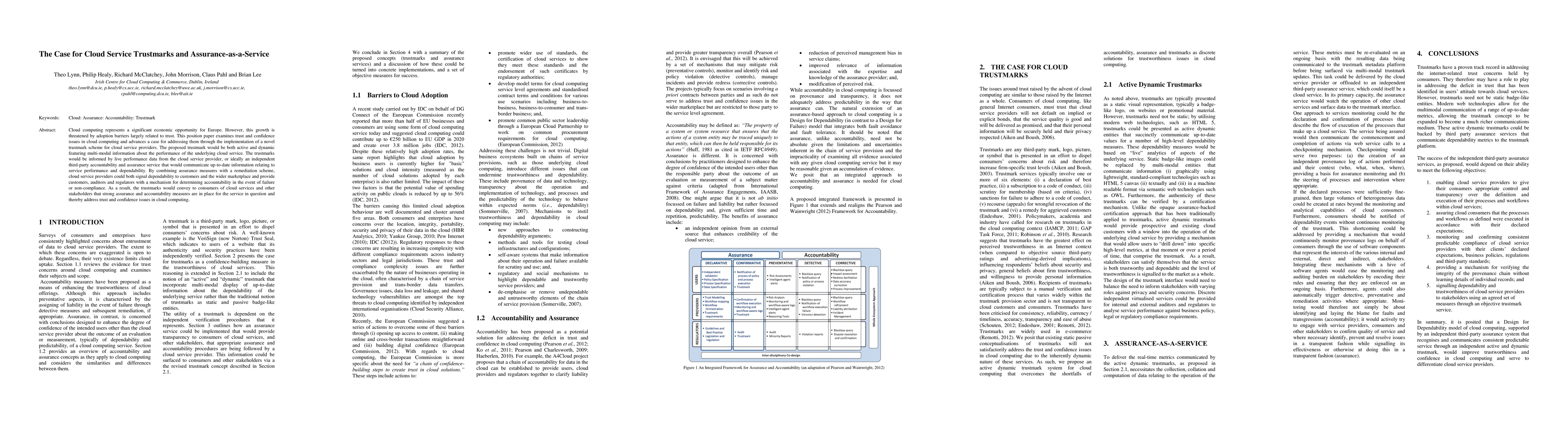 Cloud computing represents a significant economic opportunity for Europe. However, this growth is threatened by adoption barriers largely related to trust. This position paper examines trust and confidence issues in cloud computing and advances a case for addressing them through the implementation of a novel trustmark scheme for cloud service providers. The proposed trustmark would be both active and dynamic featuring multi-modal information about the performance of the underlying cloud service. The trustmarks would be informed by live performance data from the cloud service provider, or ideally an independent third-party accountability and assurance service that would communicate up-to-date information relating to service performance and dependability. By combining assurance measures with a remediation scheme, cloud service providers could both signal dependability to customers and the wider marketplace and provide customers, auditors and regulators with a mechanism for determining accountability in the event of failure or non-compliance. As a result, the trustmarks would convey to consumers of cloud services and other stakeholders that strong assurance and accountability measures are in place for the service in question and thereby address trust and confidence issues in cloud computing.