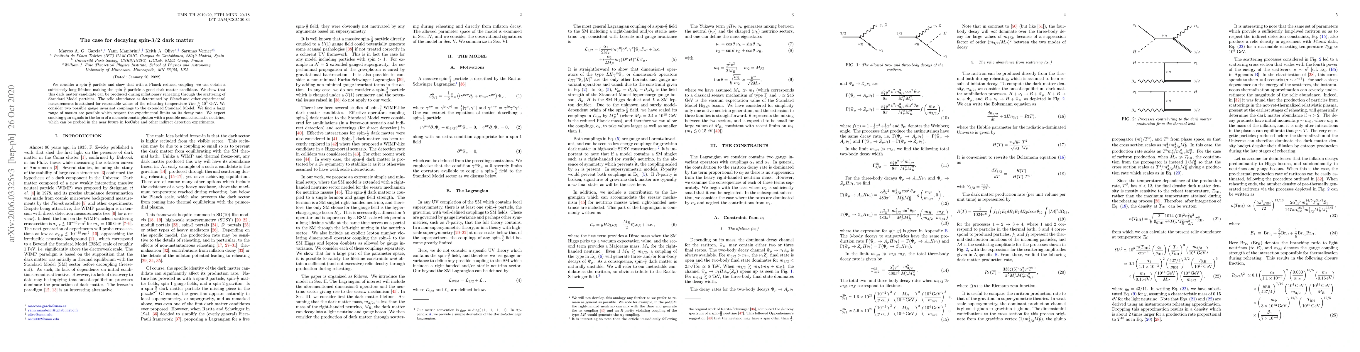 This paper proposes a spin-3/2 particle coupled with a sterile neutrino sector as a viable dark matter candidate, showing it can be produced during inflationary reheating and aligns with observed relic abundances. Anticipated signals in future experiments include a monochromatic photon and possibly a neutrino.