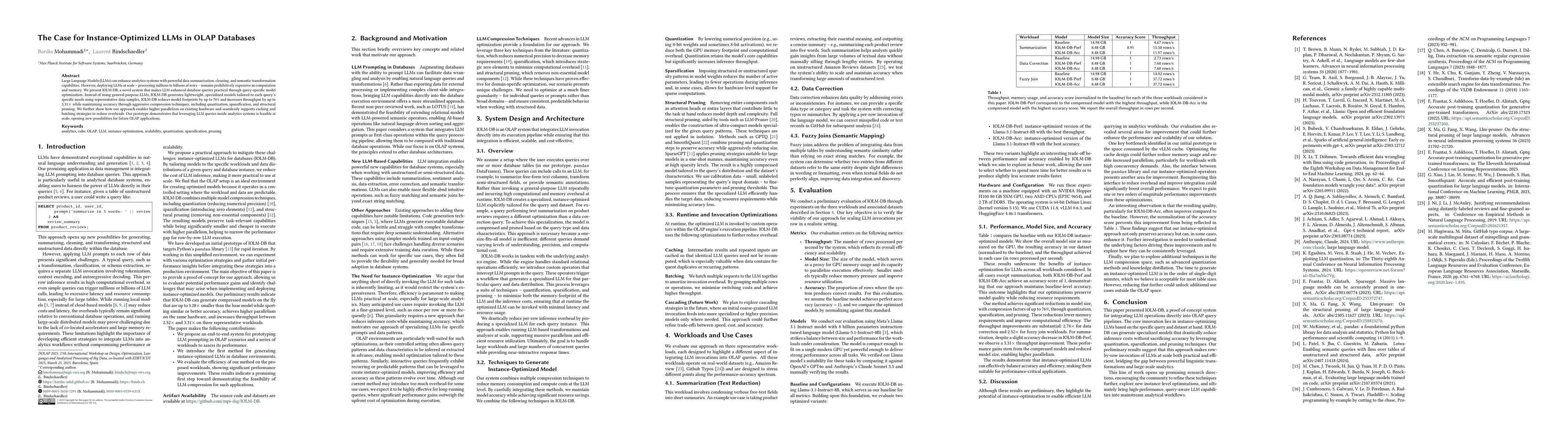 Large Language Models (LLMs) can enhance analytics systems with powerful data summarization, cleaning, and semantic transformation capabilities. However, deploying LLMs at scale -- processing millions to billions of rows -- remains prohibitively expensive in computation and memory. We present IOLM-DB, a novel system that makes LLM-enhanced database queries practical through query-specific model optimization. Instead of using general-purpose LLMs, IOLM-DB generates lightweight, specialized models tailored to each query's specific needs using representative data samples. IOLM-DB reduces model footprints by up to 76% and increases throughput by up to 3.31$\times$ while maintaining accuracy through aggressive compression techniques, including quantization, sparsification, and structural pruning. We further show how our approach enables higher parallelism on existing hardware and seamlessly supports caching and batching strategies to reduce overheads. Our prototype demonstrates that leveraging LLM queries inside analytics systems is feasible at scale, opening new possibilities for future OLAP applications.