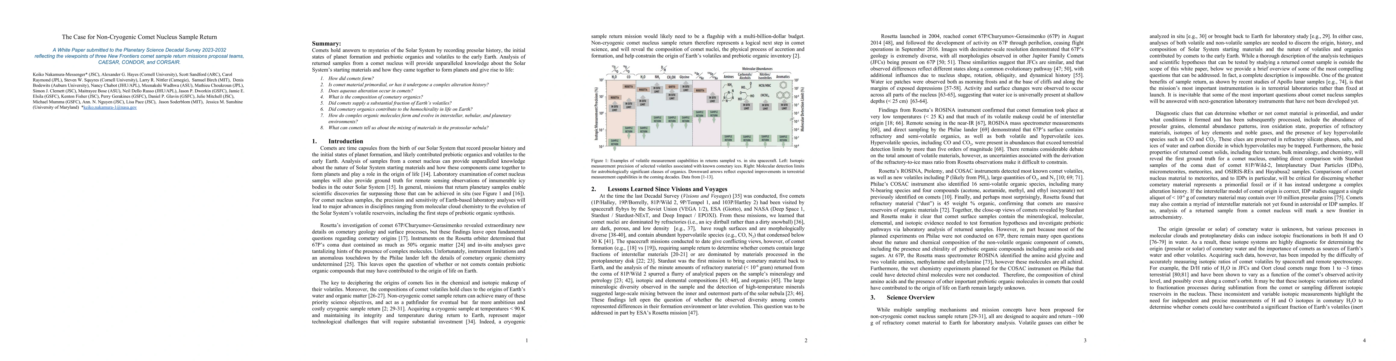 This research advocates for non-cryogenic comet nucleus sample return to unlock Solar System origins, addressing formation, alteration, and composition of comets. It emphasizes understanding Earth's volatile supply, organic contributions, and molecular evolution, shedding light on protosolar nebula mixing.