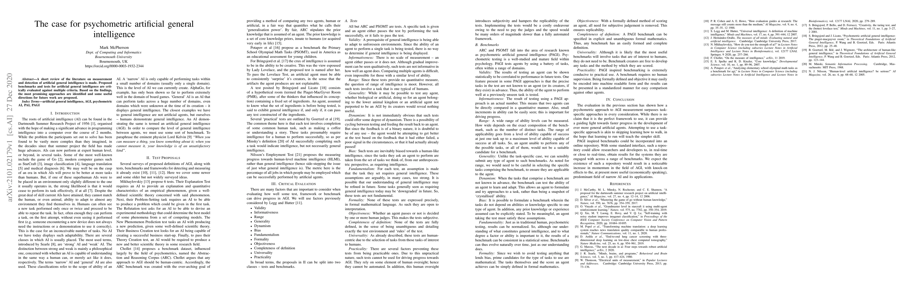 A short review of the literature on measurement and detection of artificial general intelligence is made. Proposed benchmarks and tests for artificial general intelligence are critically evaluated against multiple criteria. Based on the findings, the most promising approaches are identified and some useful directions for future work are proposed.