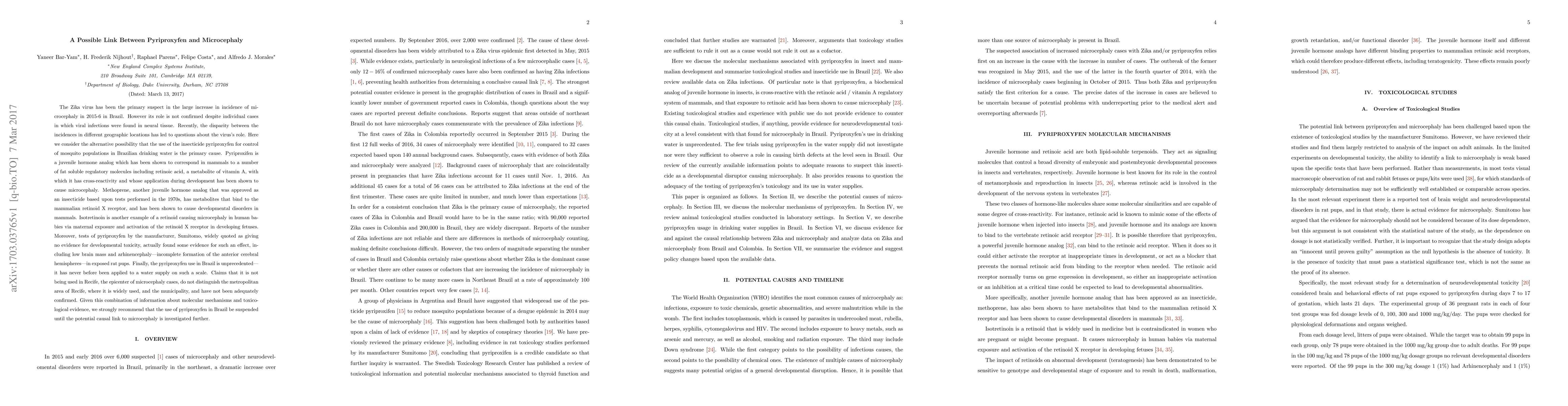 This paper investigates whether pyriproxyfen, an insecticide used in Brazilian drinking water, could be a primary or cofactor cause of microcephaly in Brazil, given its structural similarity to retinoic acid and evidence of developmental disorders in rats. The authors argue against Zika virus as the sole cause due to geographic discrepancies and call for further investigation into pyriproxyfen's role before resuming its use.