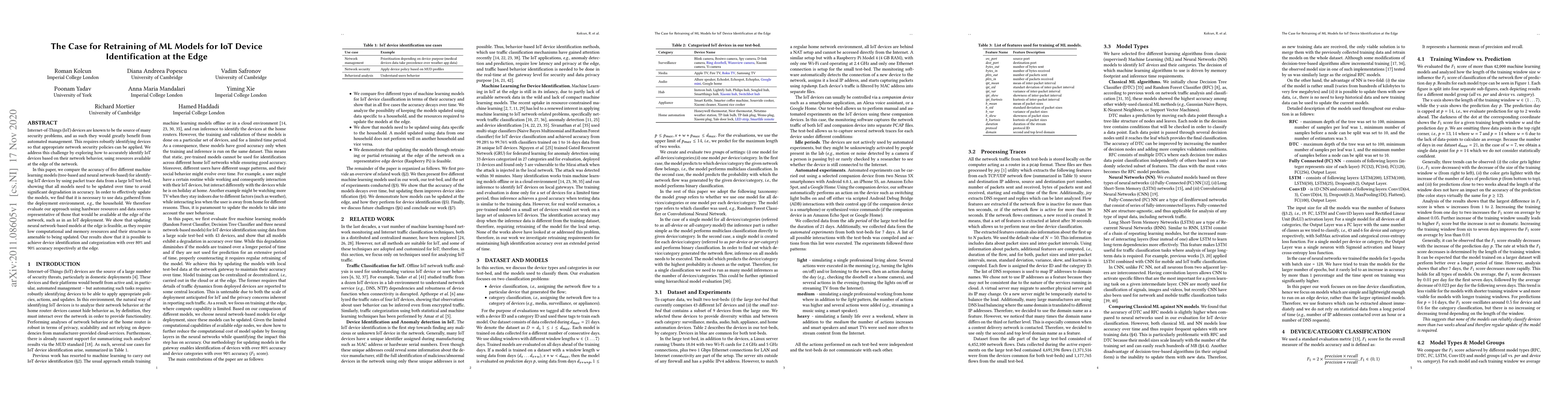 Researchers found that machine learning models need to be updated regularly to accurately identify IoT devices at the edge of a network, achieving over 80% and 90% accuracy in device categorization.