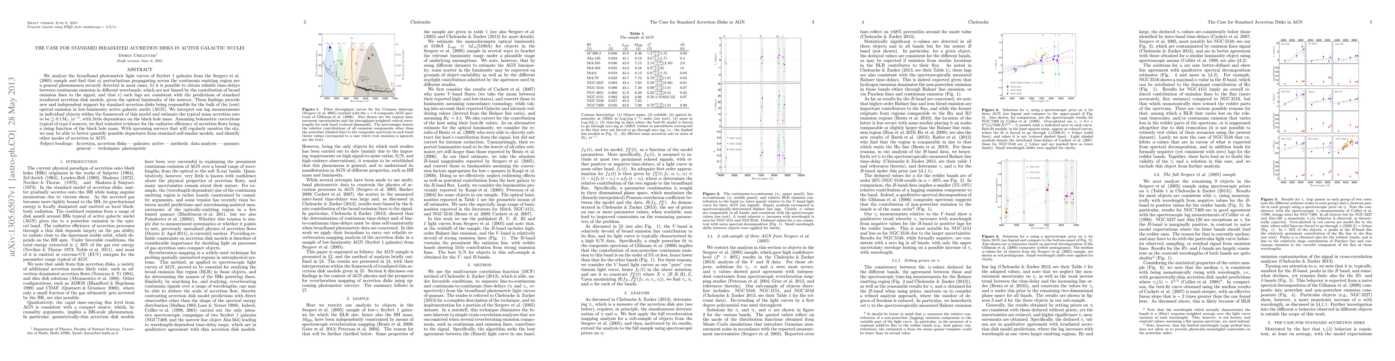 We analyze the broadband photometric light curves of Seyfert 1 galaxies from the Sergeev et al. (2005) sample and find that a) perturbations propagating across the continuum emitting region are a general phenomenon securely detected in most cases, b) it is possible to obtain reliable time-delays between continuum emission in different wavebands, which are not biased by the contribution of broad emission lines to the signal, and that c) such lags are consistent with the predictions of standard irradiated accretion disk models, given the optical luminosity of the sources. These findings provide new and independent support for standard accretion disks being responsible for the bulk of the (rest) optical emission in low-luminosity active galactic nuclei (AGN). We interpret our lag measurements in individual objects within the framework of this model and estimate the typical mass accretion rate to be <~0.1Msol/yr, with little dependence on the black hole mass. Assuming bolometric corrections typical of type-I sources, we find tentative evidence for the radiative efficiency of accretion flows being a rising function of the black hole mass. With upcoming surveys that will regularly monitor the sky, we may be able to better quantify possible departures from standard self-similar models, and identify other modes of accretion in AGN.