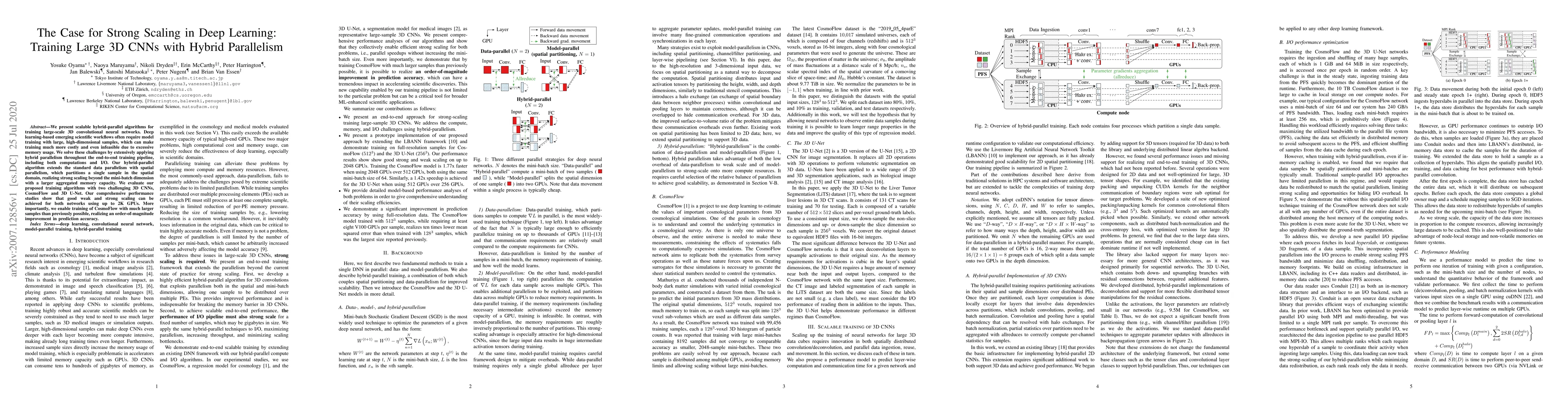 This paper introduces scalable hybrid-parallel algorithms for training large-scale 3D convolutional neural networks, addressing memory constraints through strong scaling and hybrid parallelism. The proposed approach enables training of previously infeasible models, achieving significant improvements in prediction accuracy.
