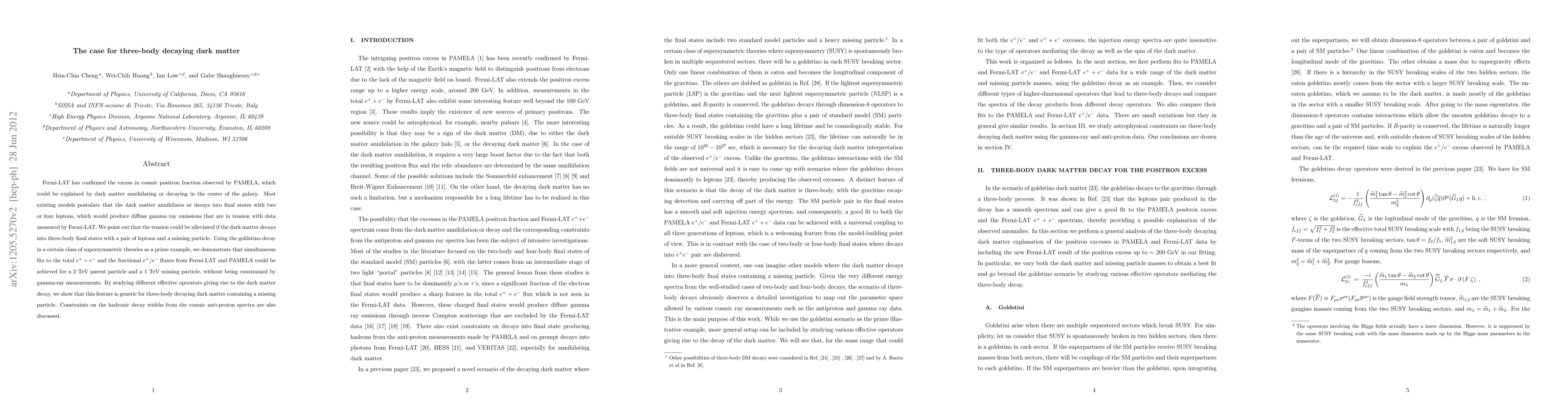 Fermi-LAT has confirmed the excess in cosmic positron fraction observed by PAMELA, which could be explained by dark matter annihilating or decaying in the center of the galaxy. Most existing models postulate that the dark matter annihilates or decays into final states with two or four leptons, which would produce diffuse gamma ray emissions that are in tension with data measured by Fermi-LAT. We point out that the tension could be alleviated if the dark matter decays into three-body final states with a pair of leptons and a missing particle. Using the goldstino decay in a certain class of supersymmetric theories as a prime example, we demonstrate that simultaneous fits to the total e+ + e- and the fractional e+/e- fluxes from Fermi-LAT and PAMELA could be achieved for a 2 TeV parent particle and a 1 TeV missing particle, without being constrained by gamma-ray measurements. By studying different effective operators giving rise to the dark matter decay, we show that this feature is generic for three-body decaying dark matter containing a missing particle. Constraints on the hadronic decay widths from the cosmic anti-proton spectra are also discussed.