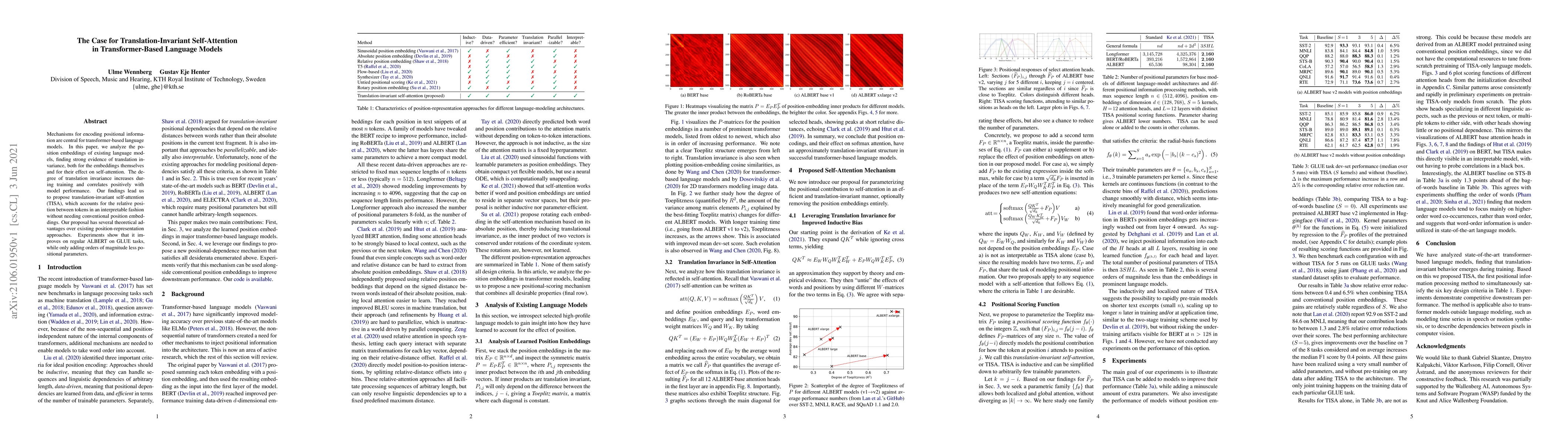 This paper argues for translation-invariant self-attention (TISA) in transformer-based language models, finding that existing models exhibit strong translation invariance in position embeddings. TISA improves performance by accounting for relative token positions without conventional embeddings, demonstrating better results on GLUE tasks with fewer parameters.